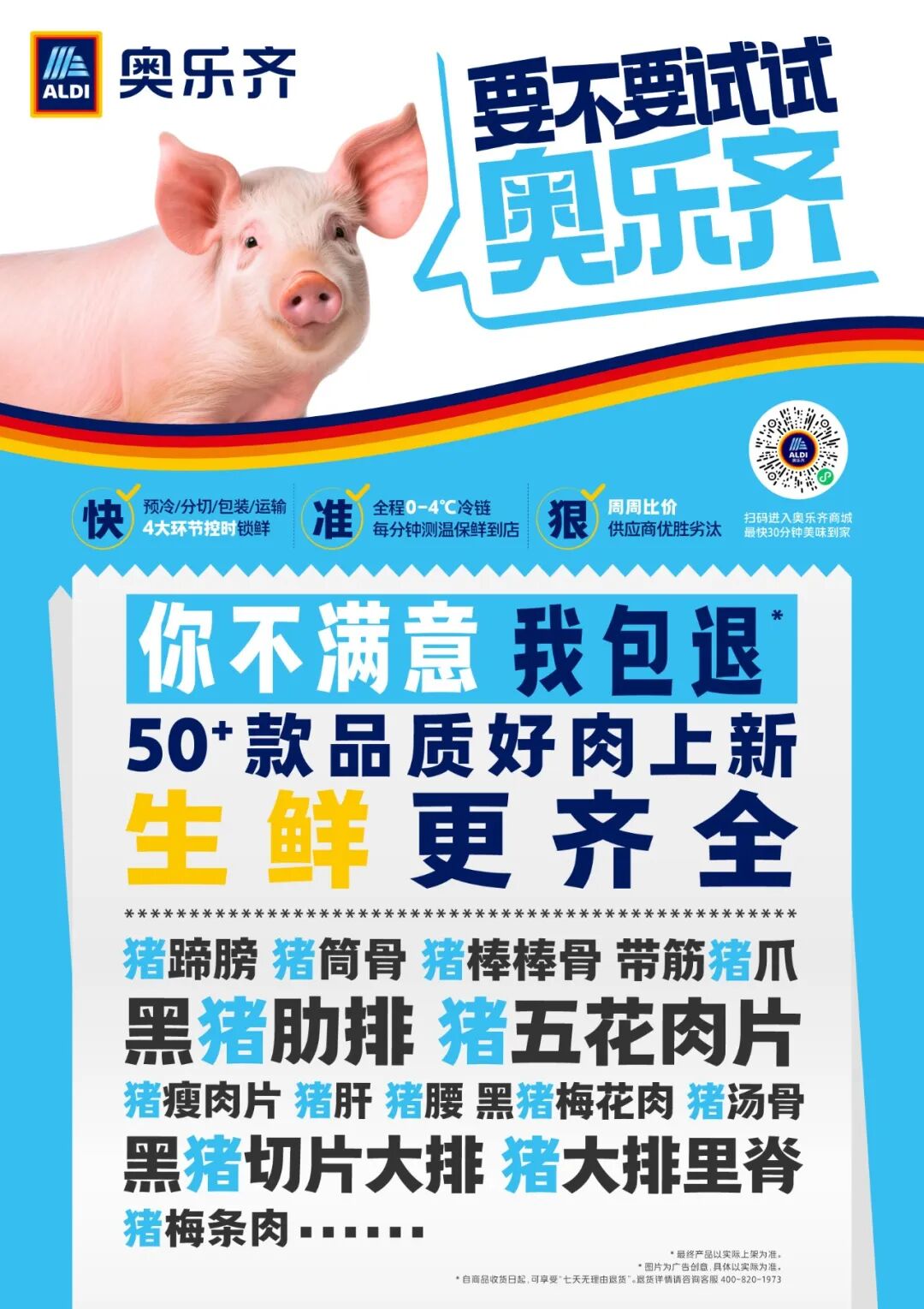 此次大规模上新生鲜肉类,ALDI奥乐齐秉承着为本地消费者服务的初心,紧密围绕上海市民的饮食文化、口味、烹饪习惯与场景等,对原有鲜肉产品线进行了更富有本地特色的扩充,并且承诺100%冷鲜肉,坚持不卖“冻化鲜的冷冻肉”。另外,在生鲜品类,奥乐齐加码推出了“七天不满意包退”的服务:自商品收货日起的七天内,如若对产品有任何不满,均可享受“七天无理由退货”服务,为上海市民带来安心、放心的高质选择。