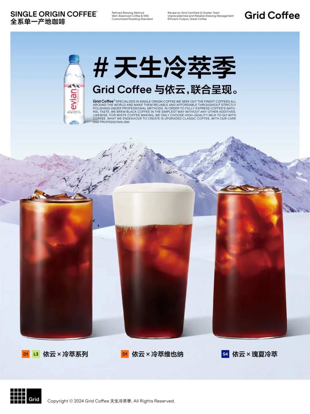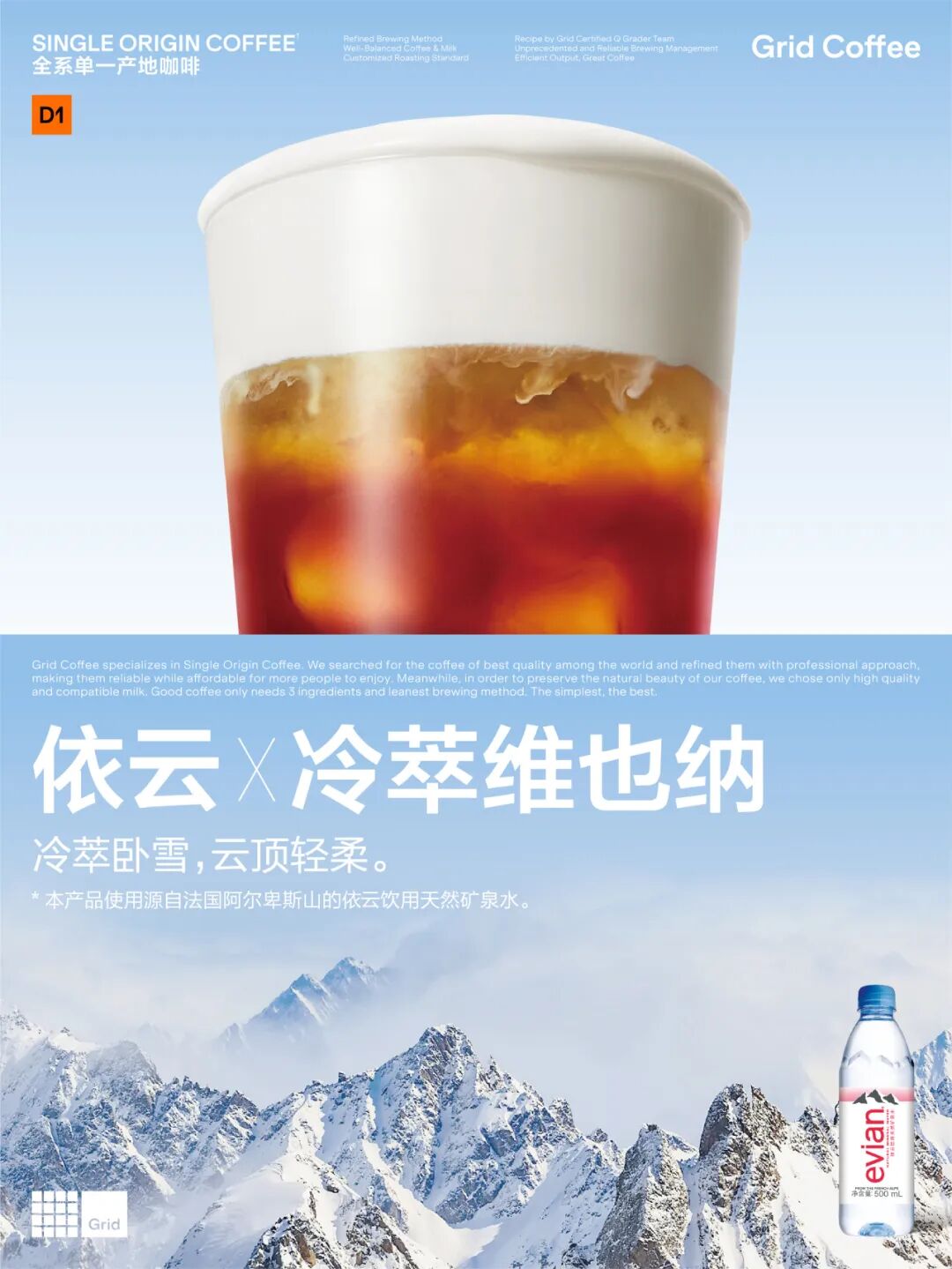Grid Coffee 冷萃季,联合依云,呈现天生好风味。好豆好水,天生一对。