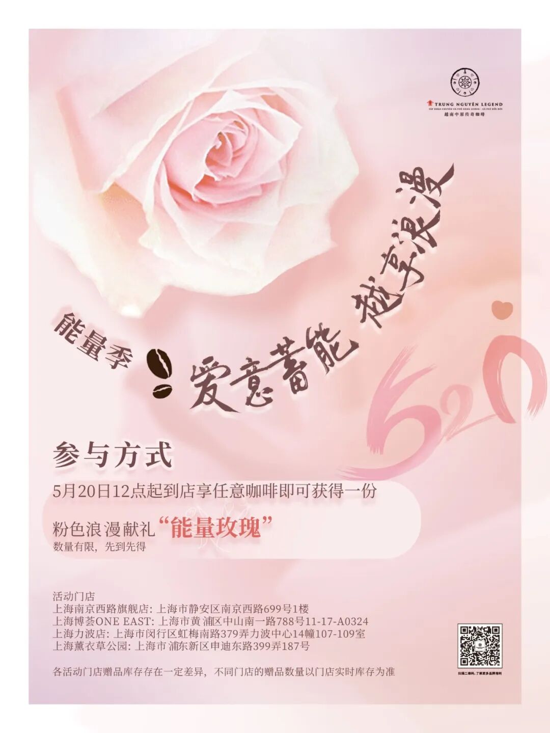 5月20日12点起,到店享任意咖啡,即可获得一份粉色浪漫献礼“能量玫瑰”,数量有限,先到先得!