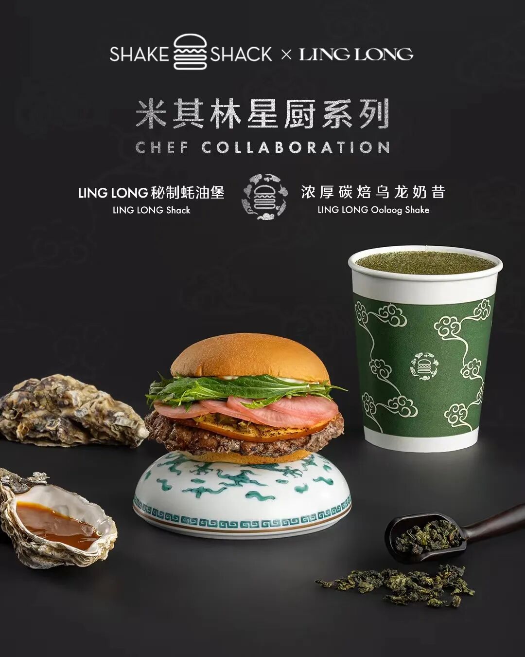LING LONG秘制蚝油堡的灵感源自LING LONG最具代表性的“蚝与牛”,配合Shake Shack特色谷饲安格斯牛肉饼的风味,选取鲜美的福建生蚝制作蚝油,经14小时以上精心熬制浓缩鲜味,更加入法葱和牛奶调制的蛋黄酱、烟熏芝士、老萝卜五香粉、XO酱,浓郁鲜香的滋味打开味蕾,赋予了中式口味汉堡新的定义。浓厚碳焙乌龙奶昔则选取安溪铁观音,经深度碳焙后与Shake Shack的奶昔基底融合后口感香醇。