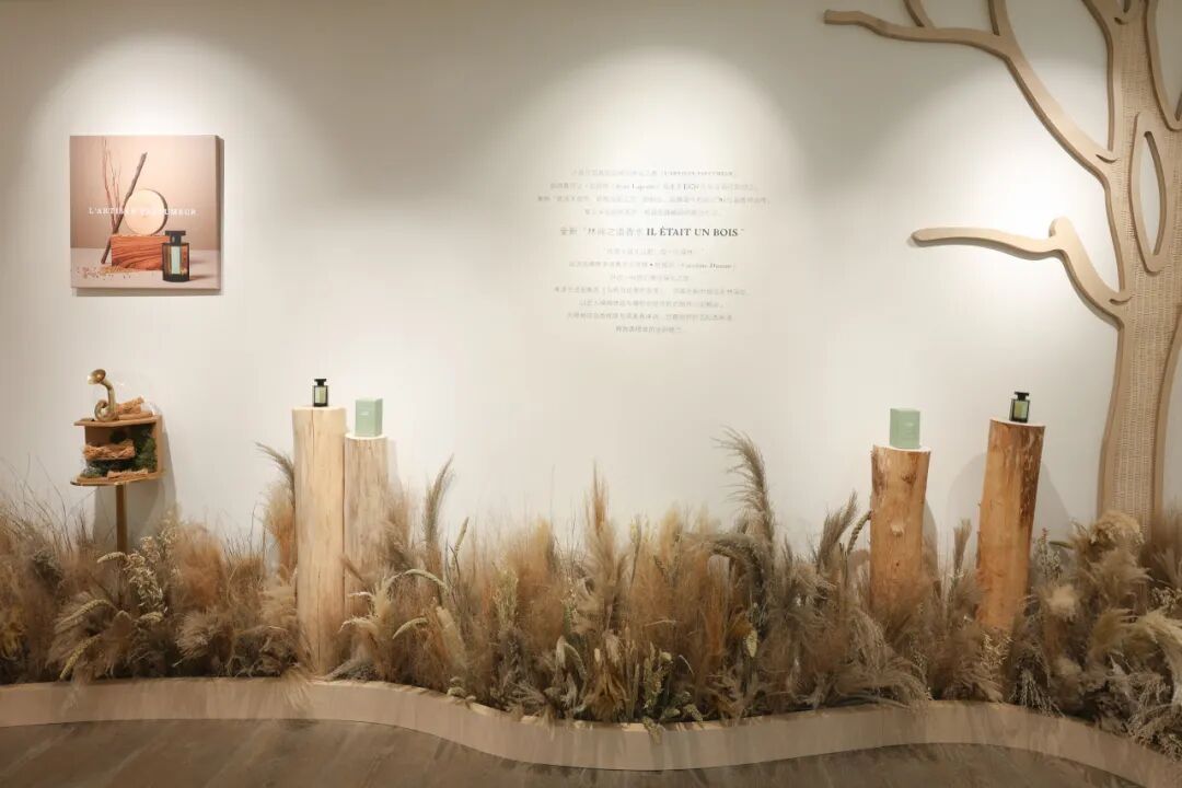 当视线透过玻璃橱窗落在林间一隅,仿佛置身于童话世界,见证法国寓言故事《乌鸦与狐狸》的生动上演。走进自然香境,林间之语香水占据视觉画面焦点,美食木质调香氤唤启感官之旅序幕,牵引来宾寻香拾忆,沉浸在灵感故事中聆听自然与艺术的碰撞回响。