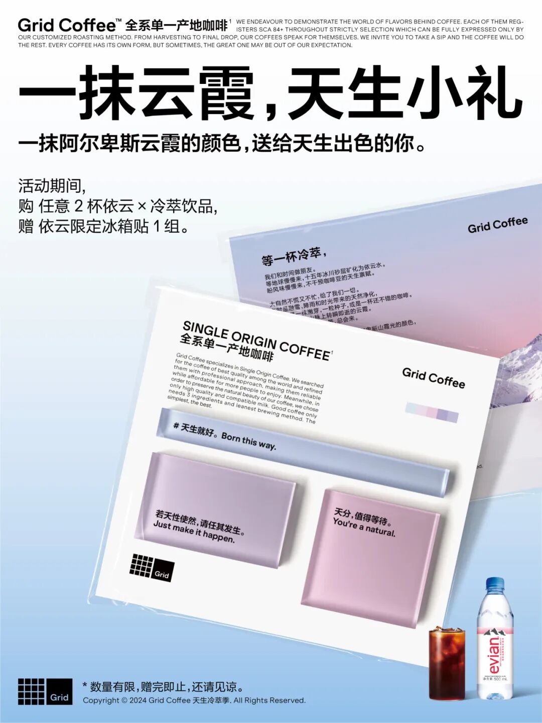 两款冷萃新品上市,另有两款常驻冷萃同步升级。活动期间,购买任意2杯依云 × 冷萃饮品,即可获赠限定冰箱贴1组。Grid Coffee 天生冷萃季欢迎你来。
