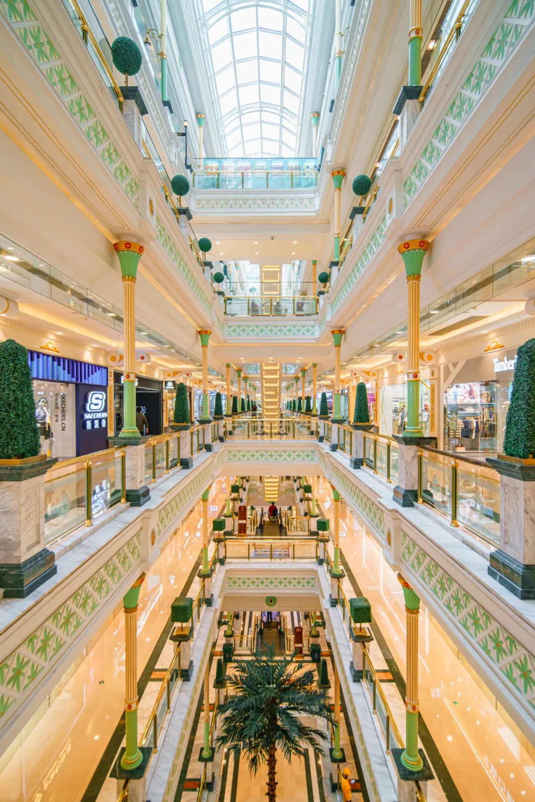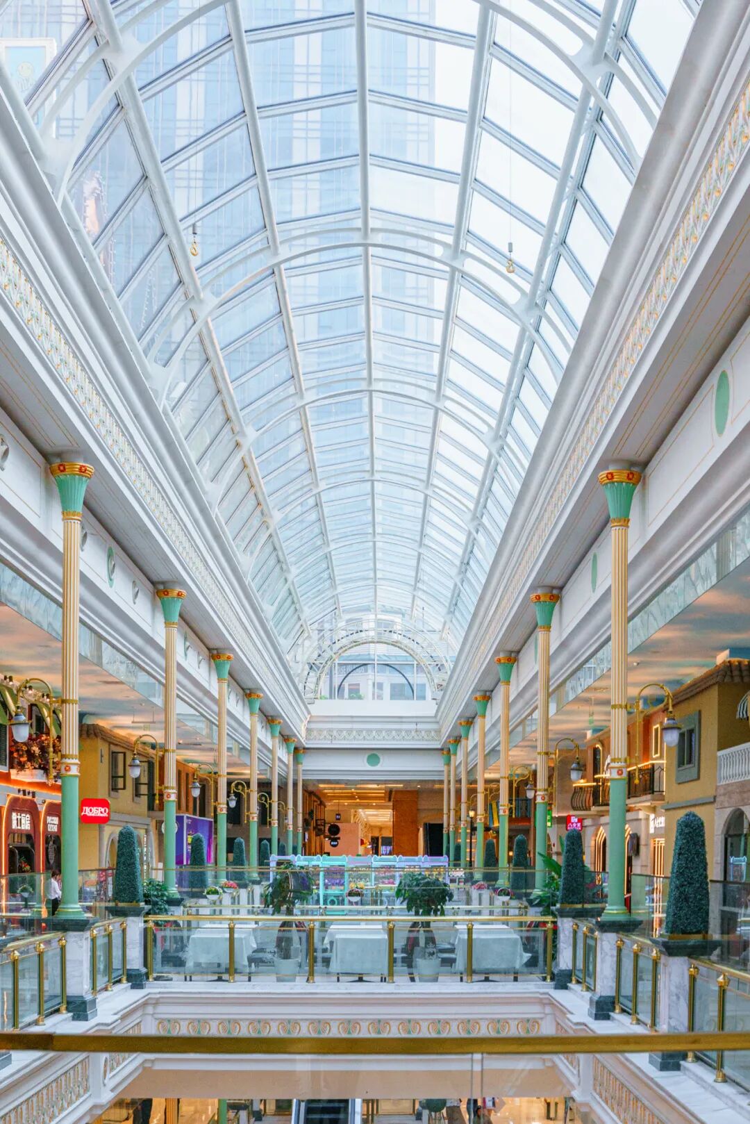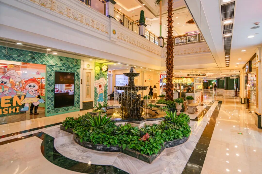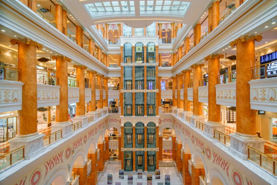 商场内部设计为欧式古典风格,色彩明艳,金碧辉煌。这种厚重华丽,甚至有点“土味”的装修风格,虽然不是时下年轻人喜欢的主流,但却特色十足,能给人带来强烈的视觉冲击感。