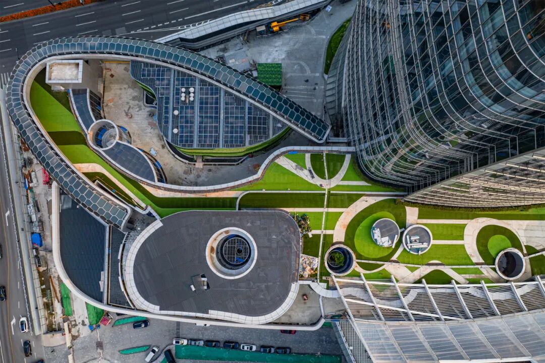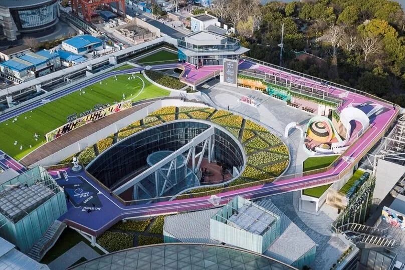 商场屋顶则打造了一个集空中景观跑道、天空球场、观景平台、景观台阶和屋顶绿化于一体的天空花园式运动休闲场所。