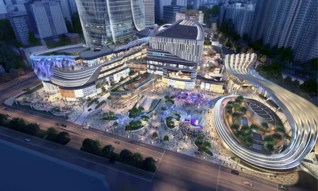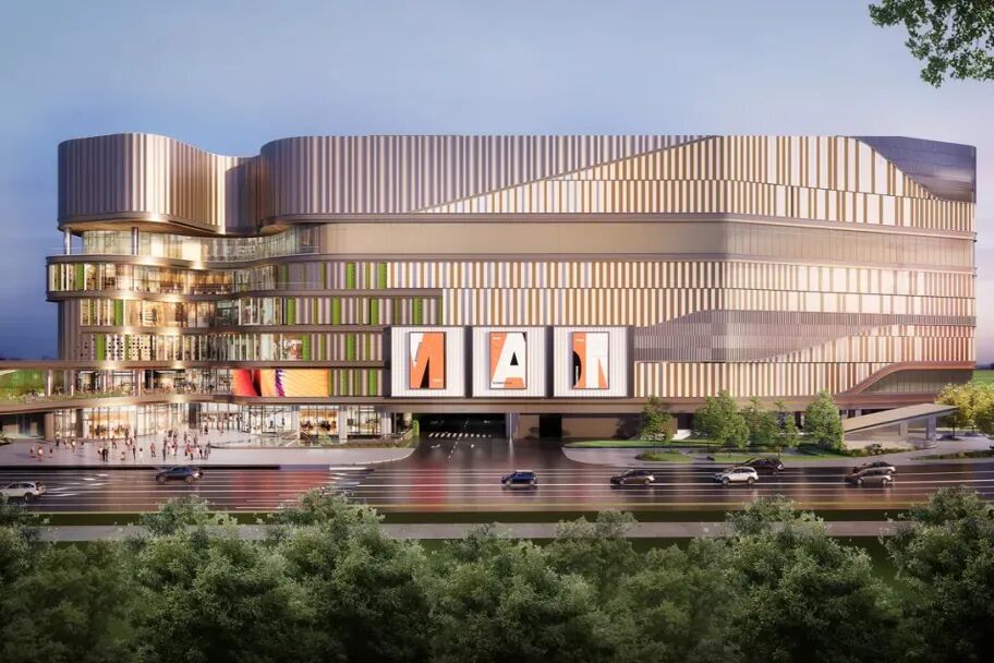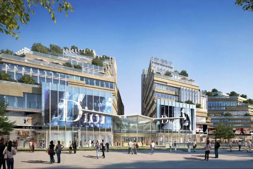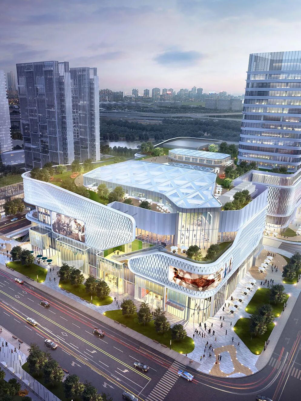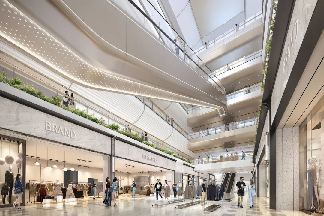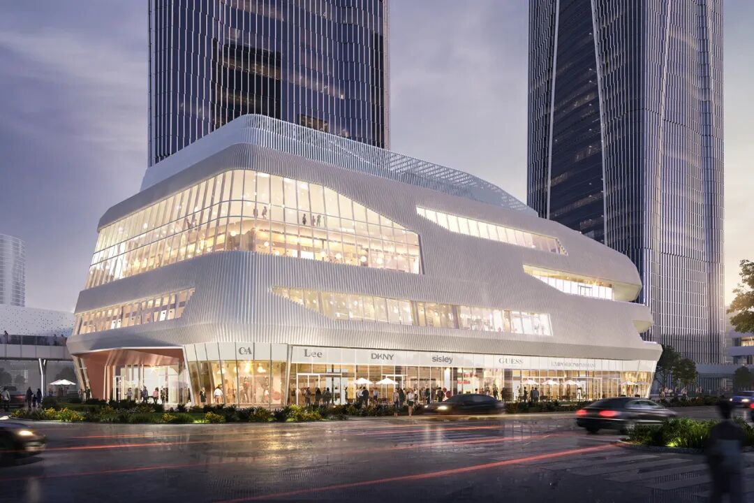 商场建筑形态曲线流畅,室内装修以及景观一体化设计,集文化、时尚、建筑、商业、饮食和自然生态于一体,计划2025年年底开业。
