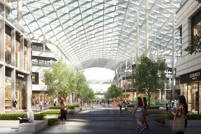 商业顶部还将创新性地打造一个6500㎡全景天幕,天幕之下,三层空中绿色走廊环成一个立体花园,超惊艳。