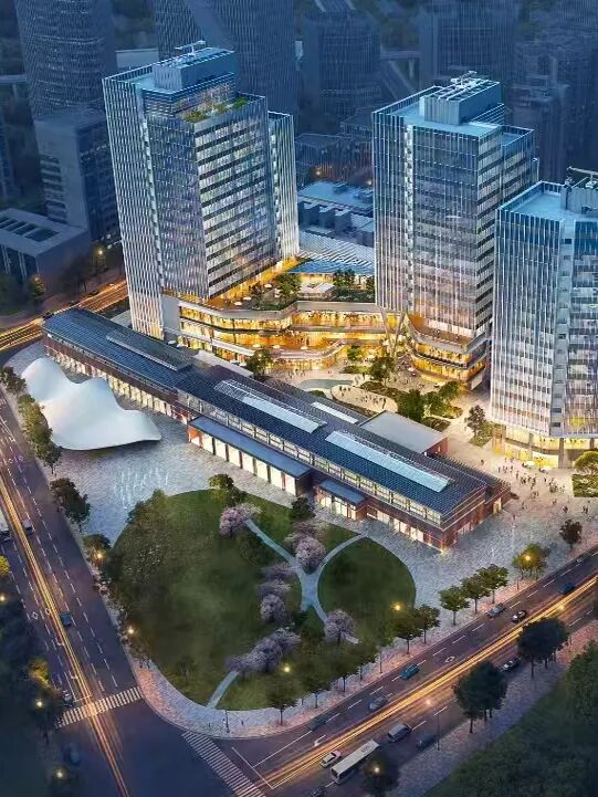 2020年初,项目一期独栋办公已经正式投入运营,二期塔楼办公和商业中心正在建设中,其中商业面积约10万㎡,由地上裙房与地下一层贯通而成,将引入观复博物馆、艺术剧场文化业态,带来魔都滨水精致商务生活。