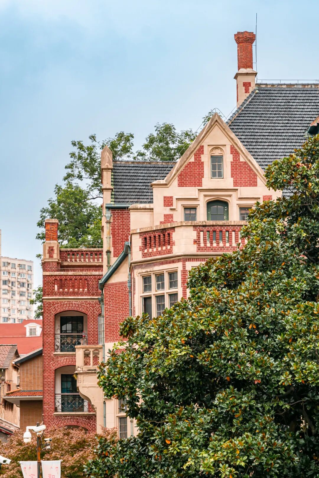建筑外墙面及围墙均为米色水泥浇铸的墙砖,古朴雅致,正面有老虎窗,别致的山墙,罗马式栏杆和空铸梅花窗栏装饰,还有漂亮尖券四坡顶,整体精美又华丽。