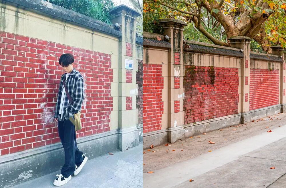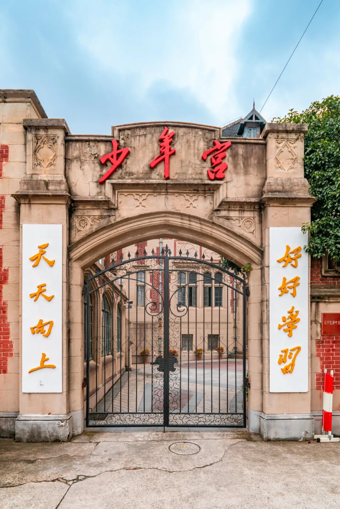 到长宁区少年宫的正门处门口的“好好学习 天天向上”标语和一排复古红墙,非常出片,知名歌手、演员檀健次就曾在这里打卡,成为很多追星女孩的最佳机位。