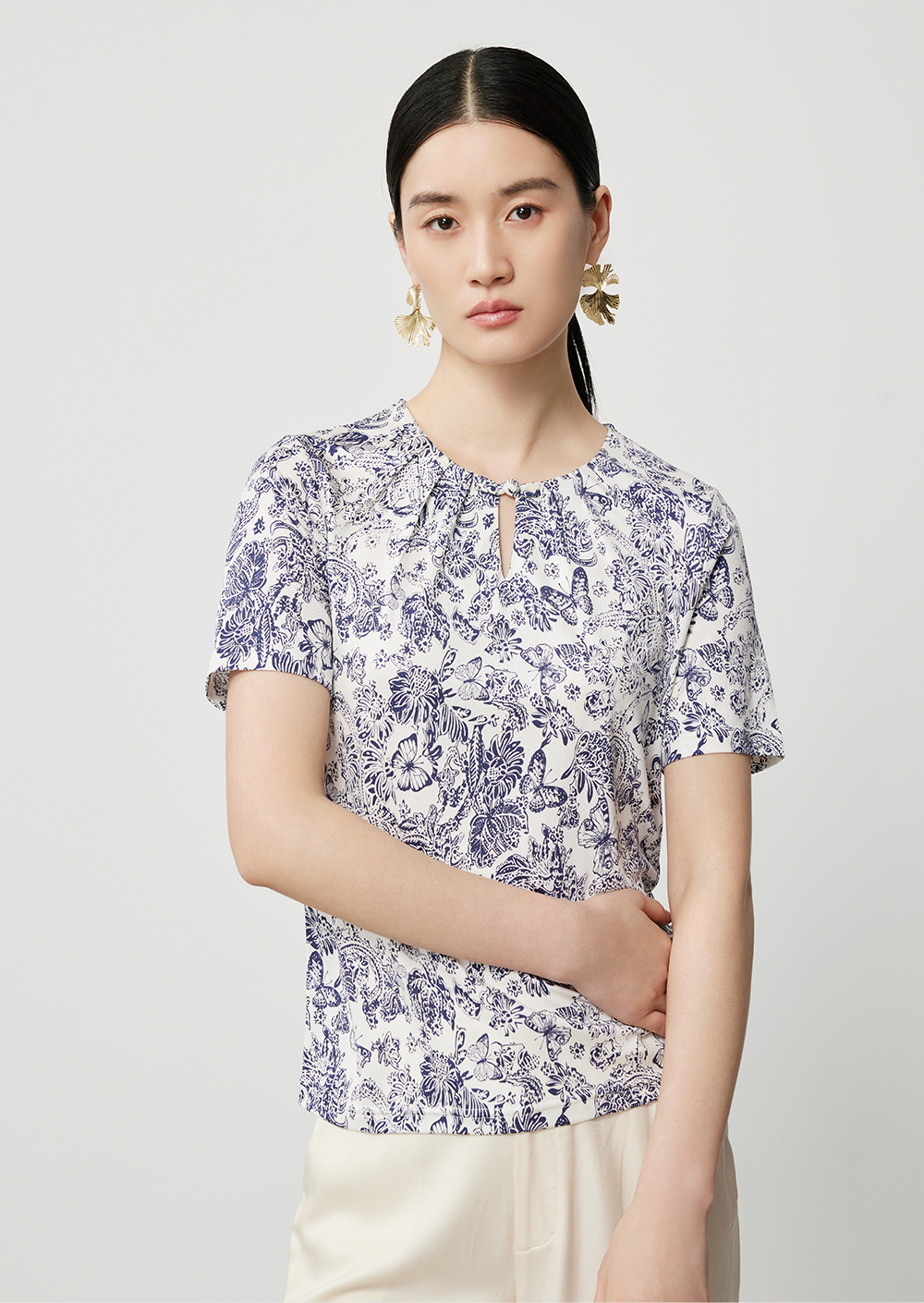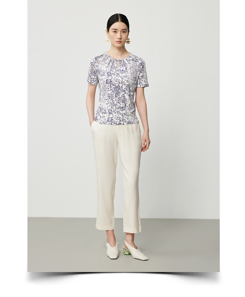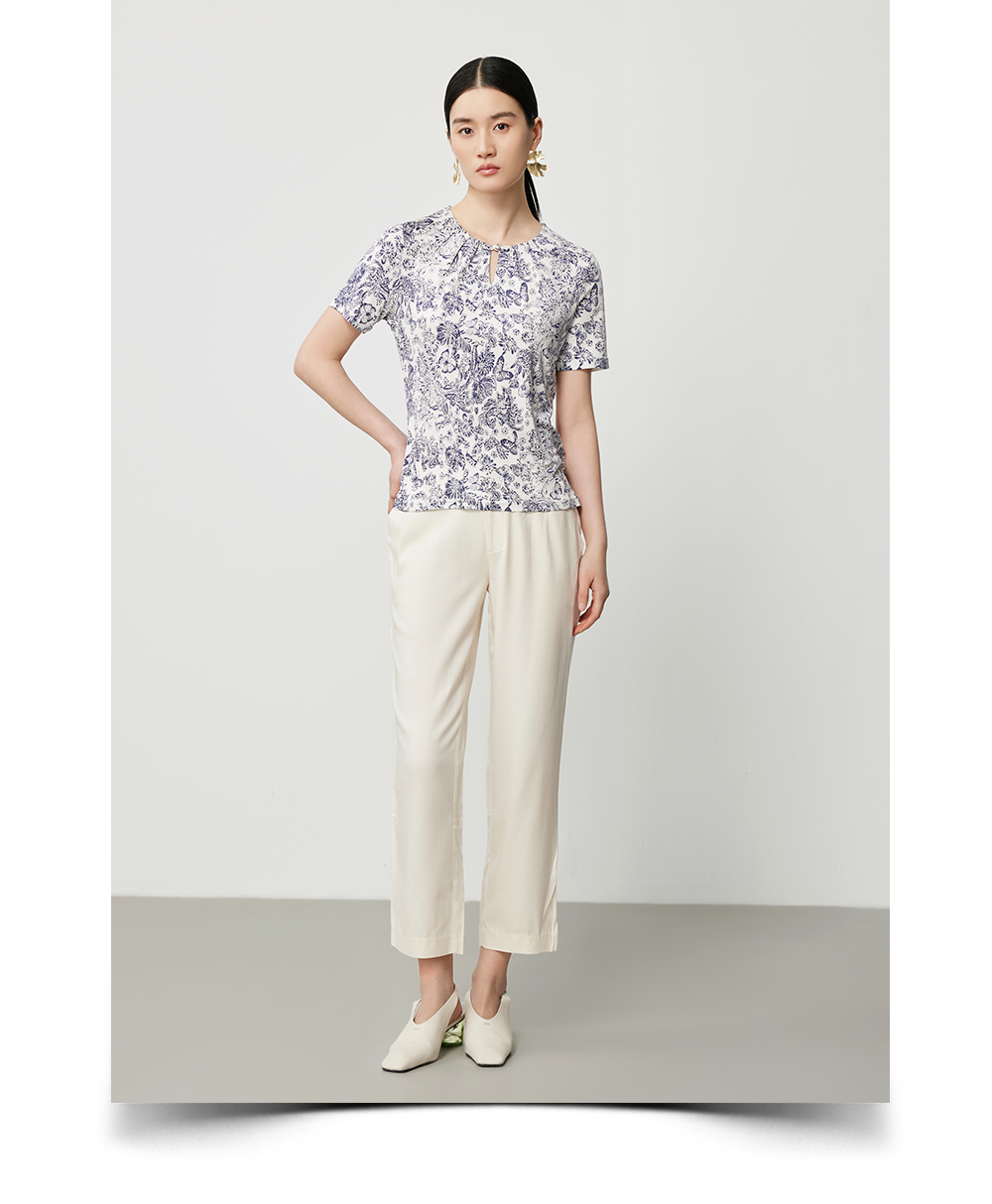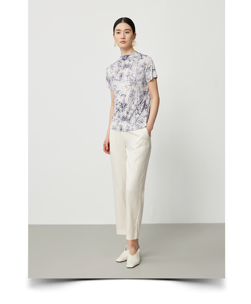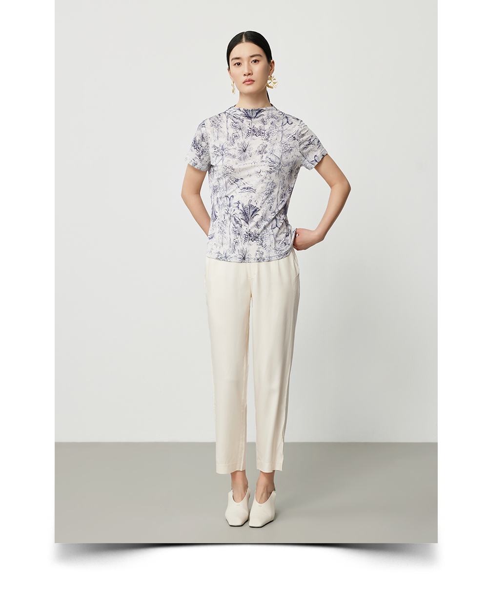 米灰真丝套衫与白色休闲裤舒意共振