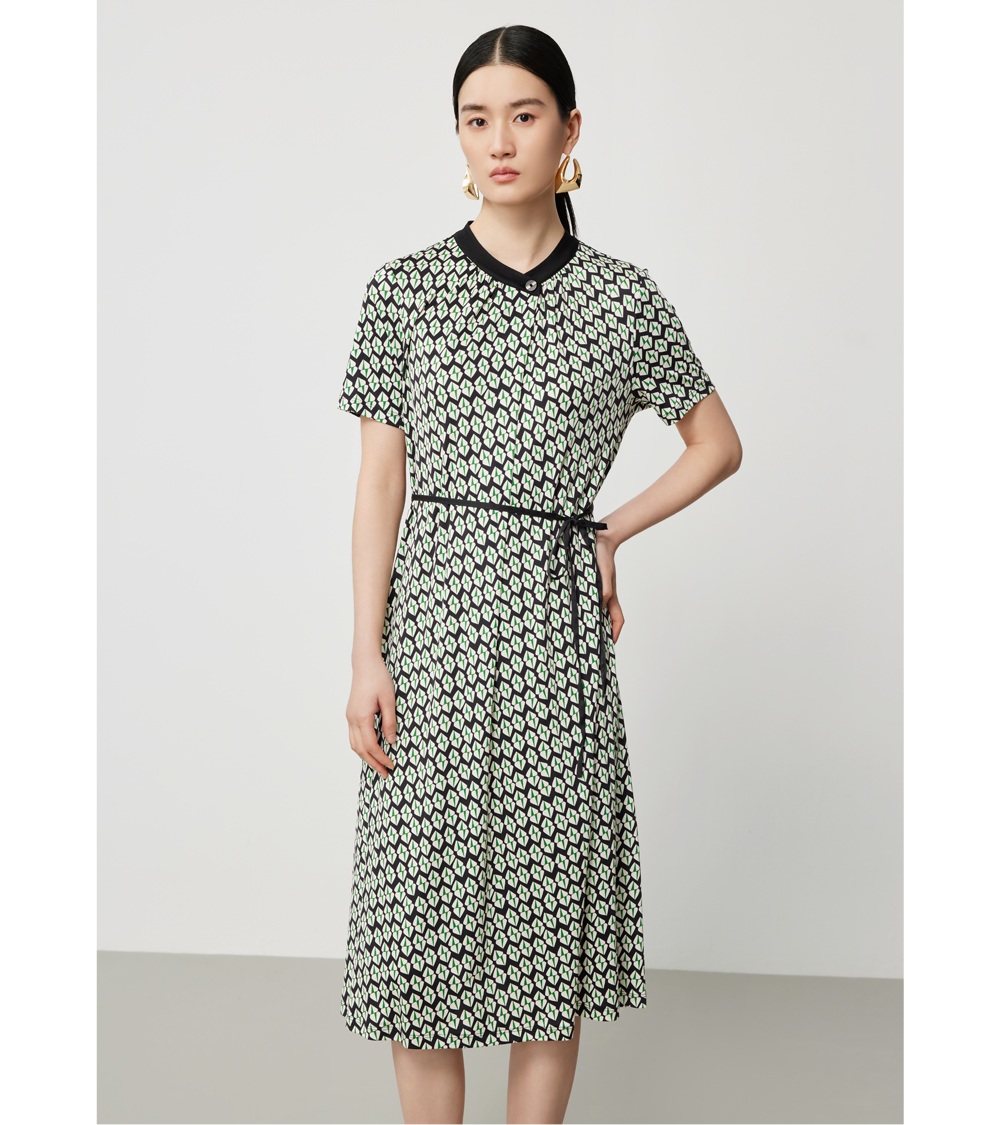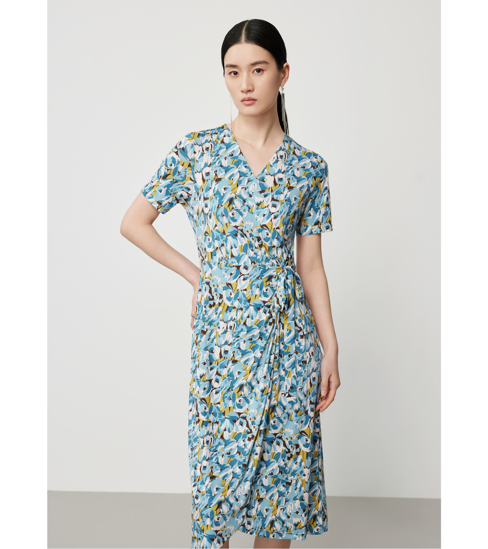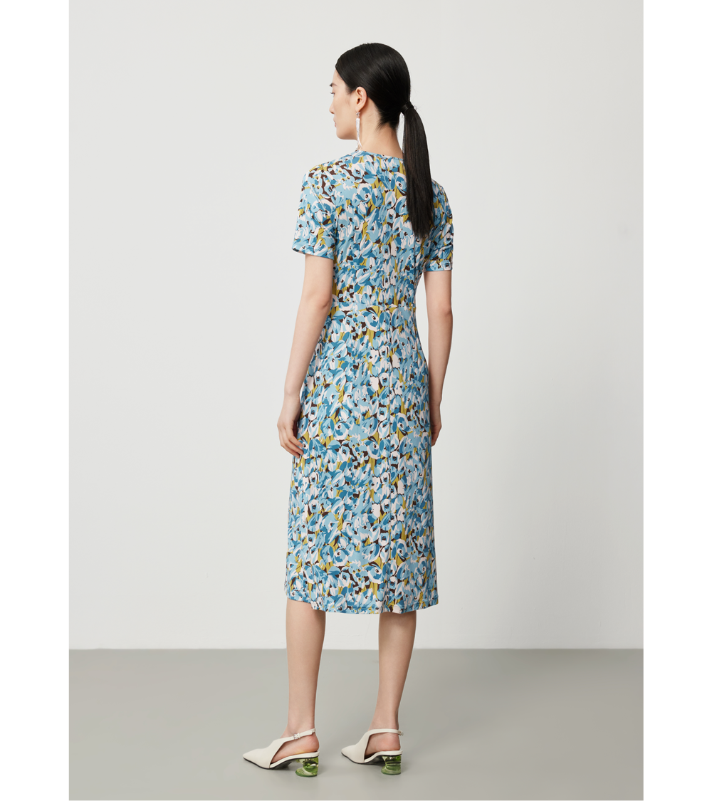 桑蚕丝印花连衣裙正悄然以浅雾蓝的晨霭