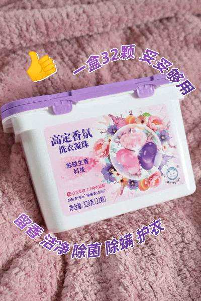 白猫高定香氛洗衣凝珠集留香/洁净/除菌/除螨/护衣(添加柔护因子)于一体,一颗可抵洗衣液、除螨剂、除菌剂、衣物香氛多个产品,省去了添加各种助剂的麻烦。