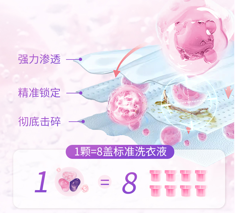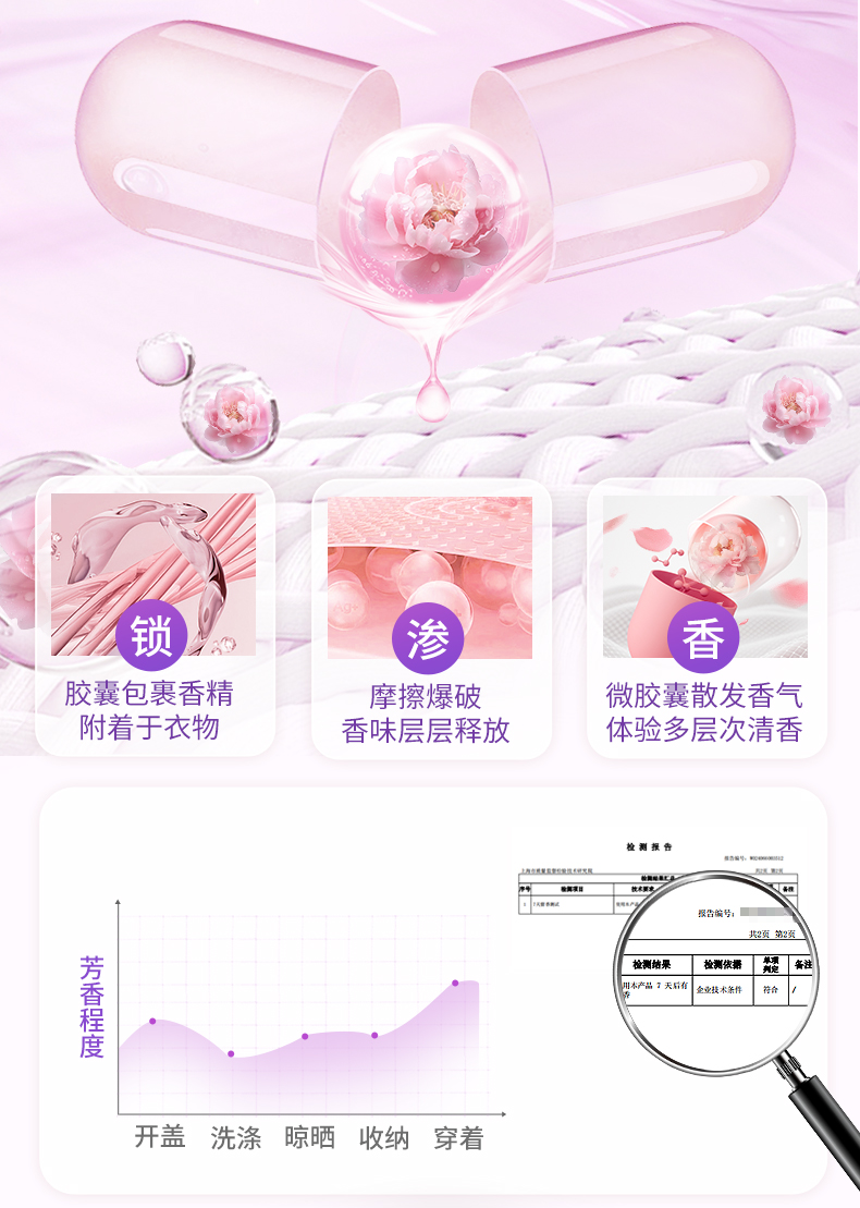 *除菌指洗除细菌,经第三方检测机构检测,在实验条件下,除菌率达到99%,实验菌种为金黄色葡萄球菌*除螨指经第三方检测机构检测,在实验条件下,对尘螨的洗除率为100%*触碰生香科技指帝斯曼芬美意微胶囊香精释放香气的技术*8倍洁净力经第三方检测机构检测,在实验条件下,当用量为标准洗衣液的1/8时,蛋白污布的去污力优于或相当于标准洗衣液,1盖洗衣液为10g的标准洗衣液*7天持久留香指经第三方检测机构检测,在实验条件下,织物经本品洗涤晾干后放置7天,仍留有香味