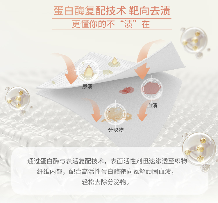 高活性蛋白酶能自动靶向识别蛋白类污渍,尤其针对瓦解顽固血渍、黄渍等蛋白类污渍,去污力我愿称之为污渍克星!