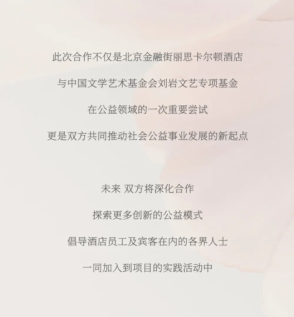 摘要:北京金融街丽思卡尔顿酒店与中国文学艺术基金会刘岩文艺专项基金,成功举行合作启动仪式