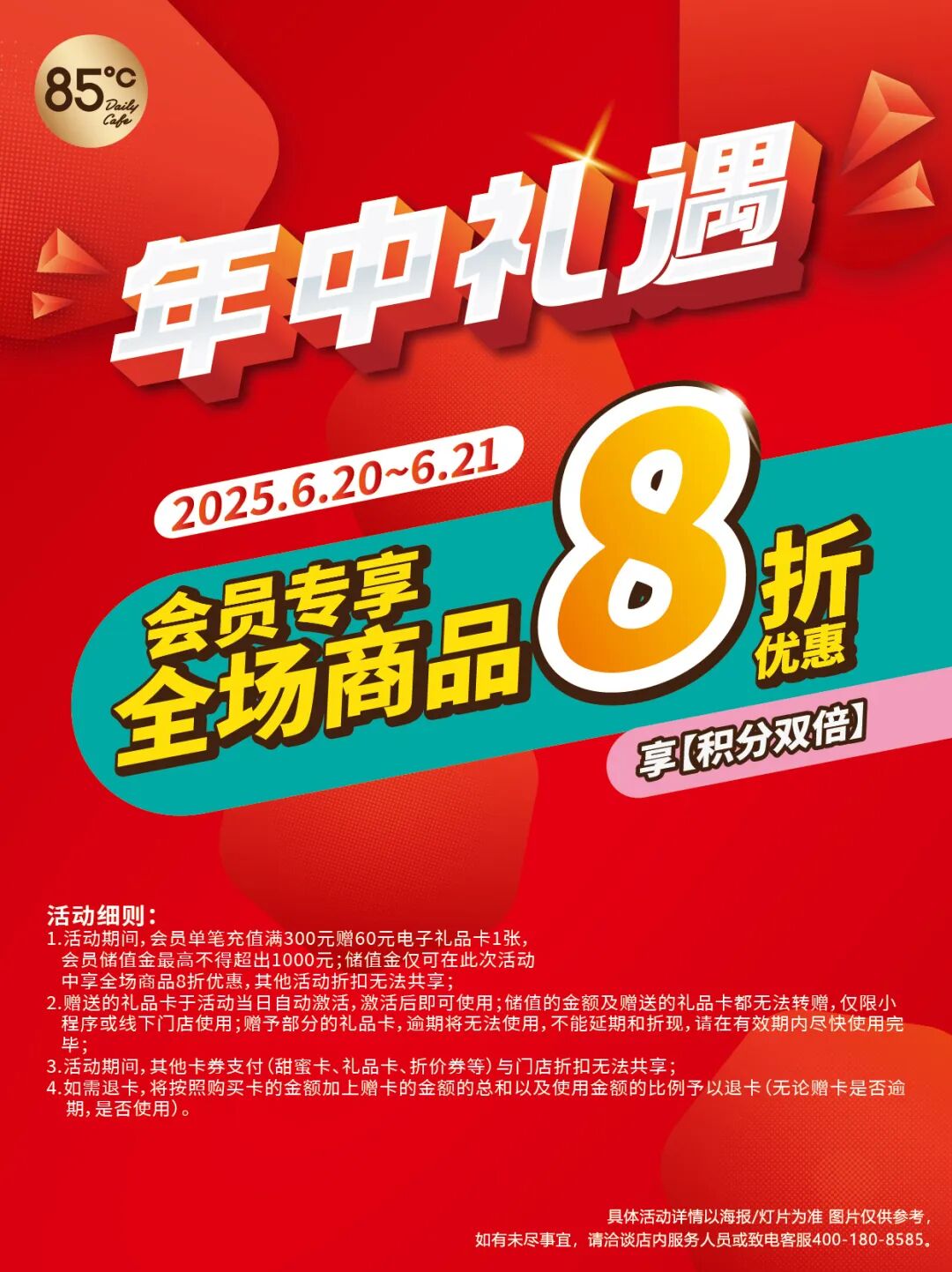 *会员储值金仅在活动当日享受全场 8 折优惠,其他活动无法共享;活动期间,其他卡券支付(甜蜜卡、礼品卡、折价券等)与门店折扣不共享;已有活动商品优惠不同享;赠送的电子礼品卡有效期 3 个月,收到后自动激活。