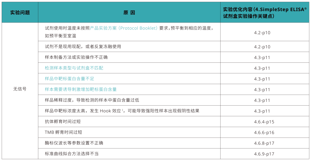 SimpleStep ELISA®试剂盒使用常见问题主要包括标准品相关问题、无信号、高背景和其它非预期信号等,本指南主要归纳总结导致这些问题的原因,以及对应的实验优化方案。(具体优化方案需参照SimpleStep ELISA® 试剂盒实验操作关键点部分内容。)