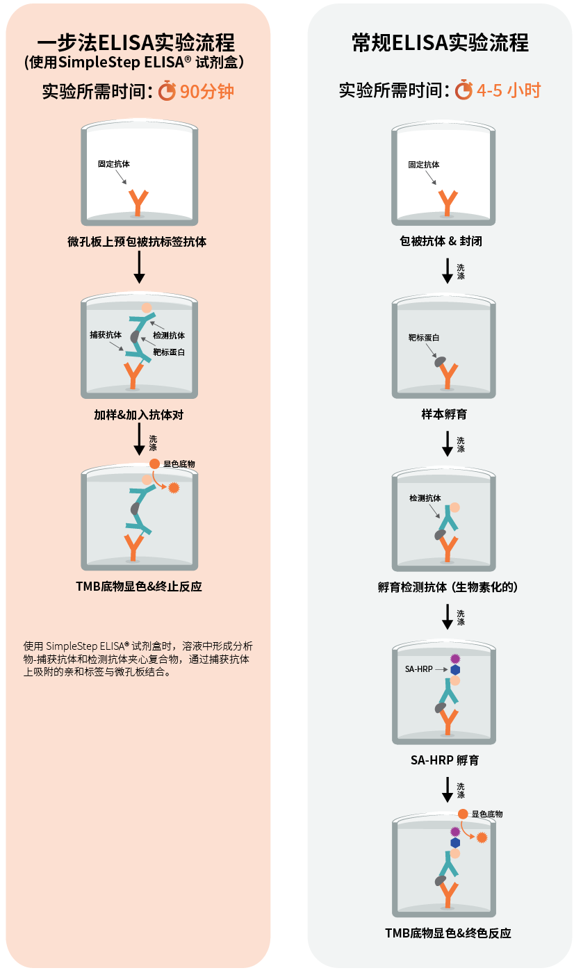 SimpleStep ELISA® 试剂盒旨在最大程度地简化 ELISA 检测并提高检测效率。与动辄需要4小时以上检测时间的常规ELISA试剂盒产品不同,SimpleStep ELISA® 试剂盒采用单次洗涤方案和重组抗体对,90 分钟内即可获得结果,在不影响检测性能的同时,特异性还有所提升。