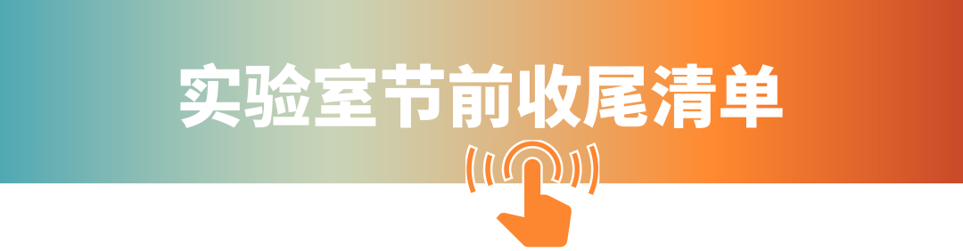 做完这一切,大家就可以放心地离开了。当然在离开实验室之前,请不要忘记检查所有的水电气,保证全部关闭。有些贵重仪器——比如高效液相色谱——在这时候也需要按照说明书清理关机。检查所有门窗是否关好,并登记实验室紧急联系人信息。最后别忘记拿走自己在实验室的贵重物品哦~