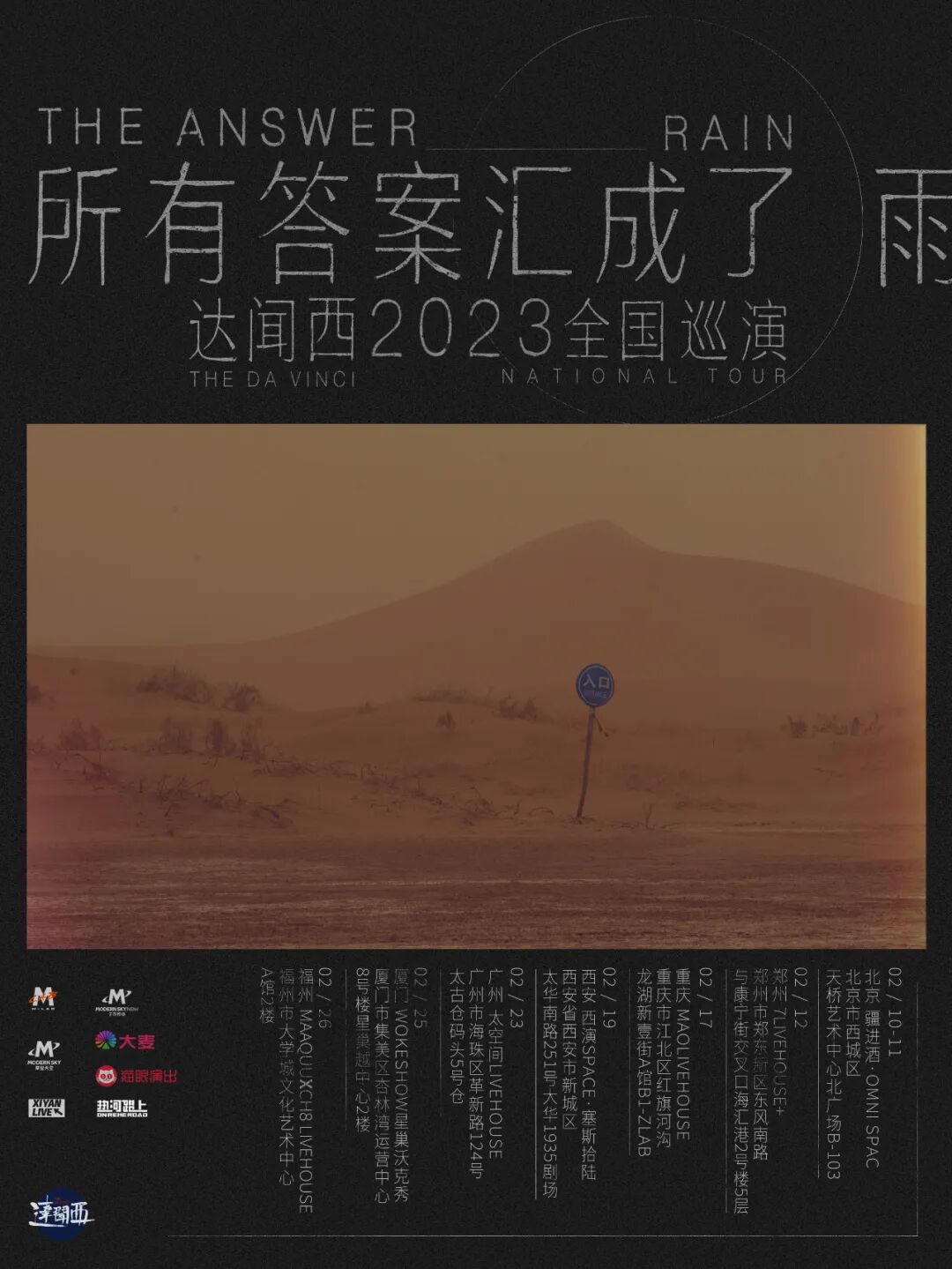 达闻西乐队去年10月推出全新迷你专辑《废土集》,随即开启了新一轮全国巡演,历经两个月,走过杭州、成都、昆明、南京、上海、台州,六座城市,所到之处,乐迷们的热情高涨。新年新出发!达闻西乐队 「所有答案汇成了雨」全国巡演再度启程,新专曲目,以及众多耳熟能详的老歌,将在此次巡演现场全新演绎。