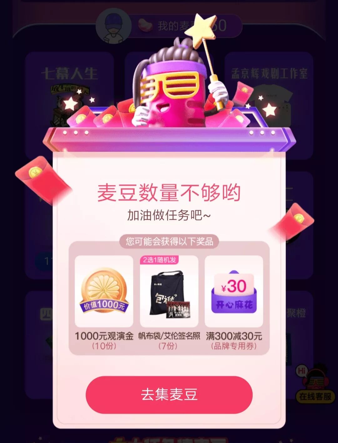 叮!本次考试到此结束!无论你得了多少分!务必都快交卷集麦豆去!“开心麻花”的专属奖池,即将开奖!大麦双11聚梦大奖,也进入开奖倒计时!你和大奖的距离,只差这些麦豆了!