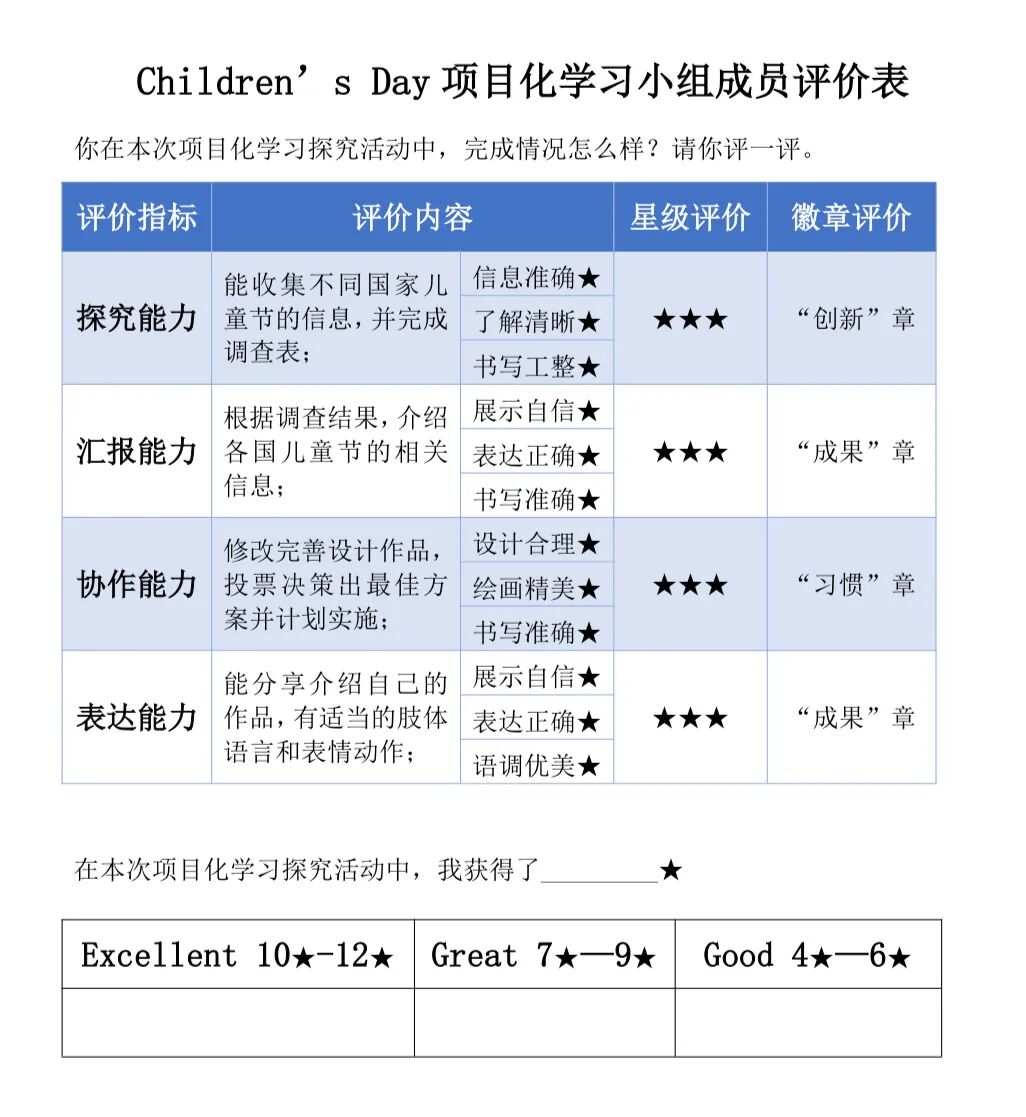 在本项目化的实施中,我们尝试通过结构化的提炼,在How can we have a meaningful Children's Day?这样的驱动性问题下,帮助学生思考本单元的主题意义。并通过一系列自主实践活动去感受、体验、思考、探究,提升了学生从低阶思维向高阶思维过渡的能力,同时也让学生在思考实践中实现深度学习,相信同学们在学习英语的过程中,定会掌握语言能力,增强文化意识,开拓思维品质,提升学习能力。
