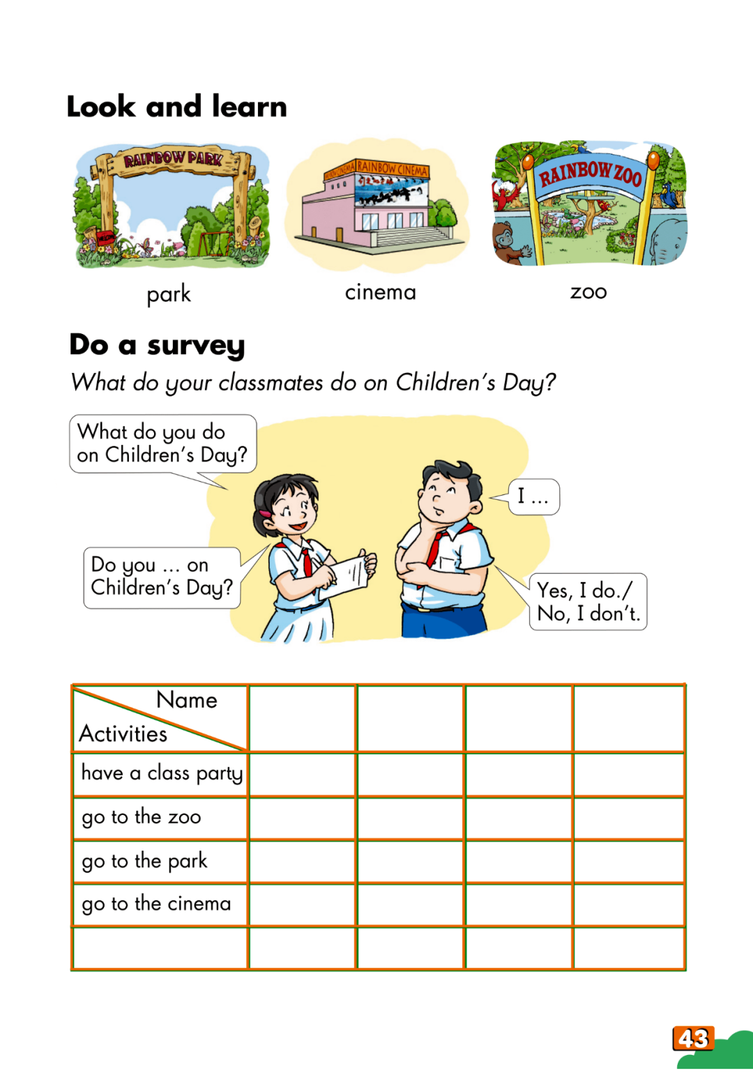1. 在语境中初步感知、理解与运用park, cinema, zoo等常见的场所类单词;能初步知晓、理解与运用常见的核心短语;能合理运用In the morning/ afternoon/ evening, I go to ... with ... We (do)... 等描述儿童节活动。
