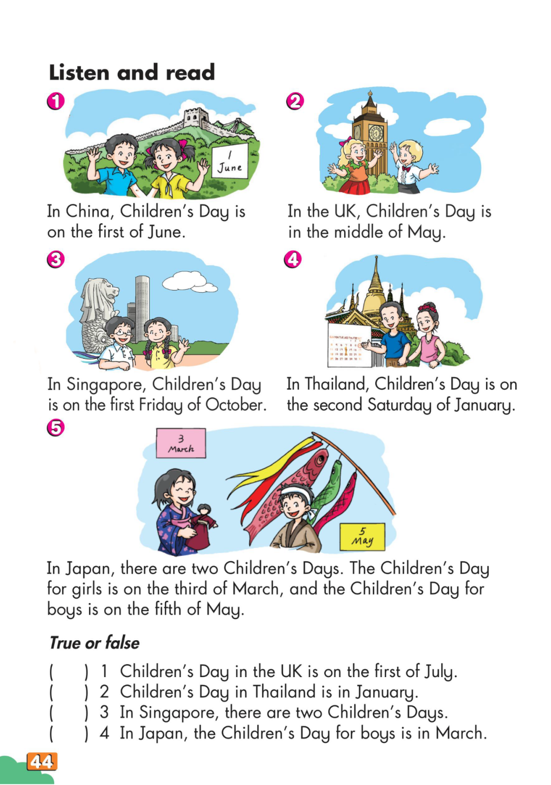 1. 通过学习Listen and read,了解其他国家儿童节的习俗等相关知识。