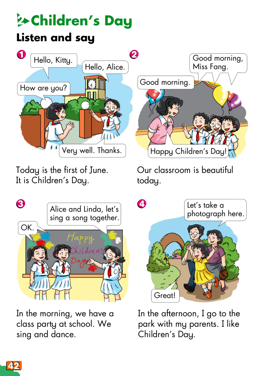 2. 通过学习 Look and learn, Listen and say, Listen and enjoy了解我们的儿童节是怎样过的。