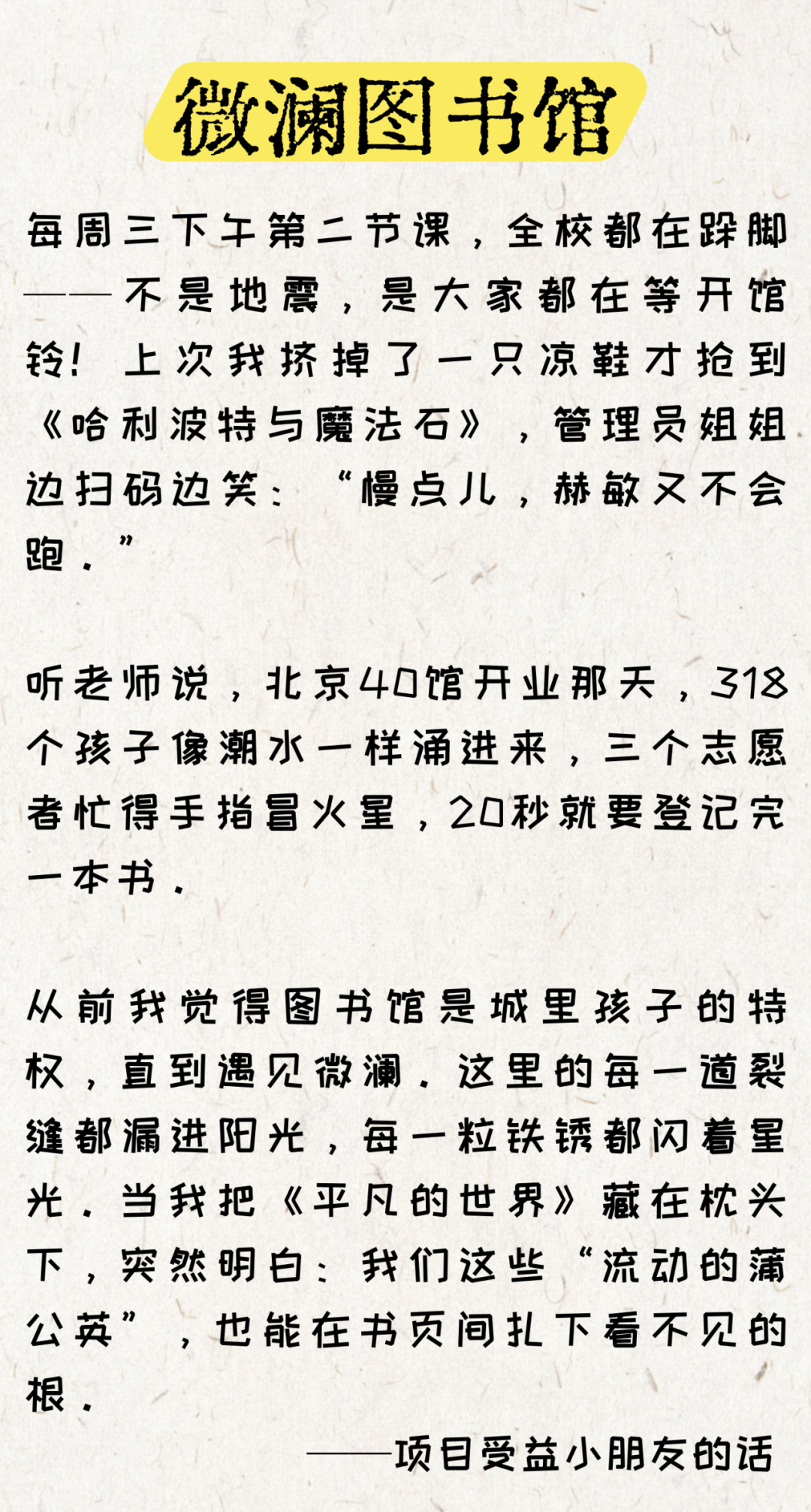 值此世界读书日,让我们共同行动:捐一本旧书,让闲置的知识流动成河;支持“ME计划”,助力更多“微型图书馆”在角落生根;践行亲子共读,让每个夜晚都有故事照亮成长。
