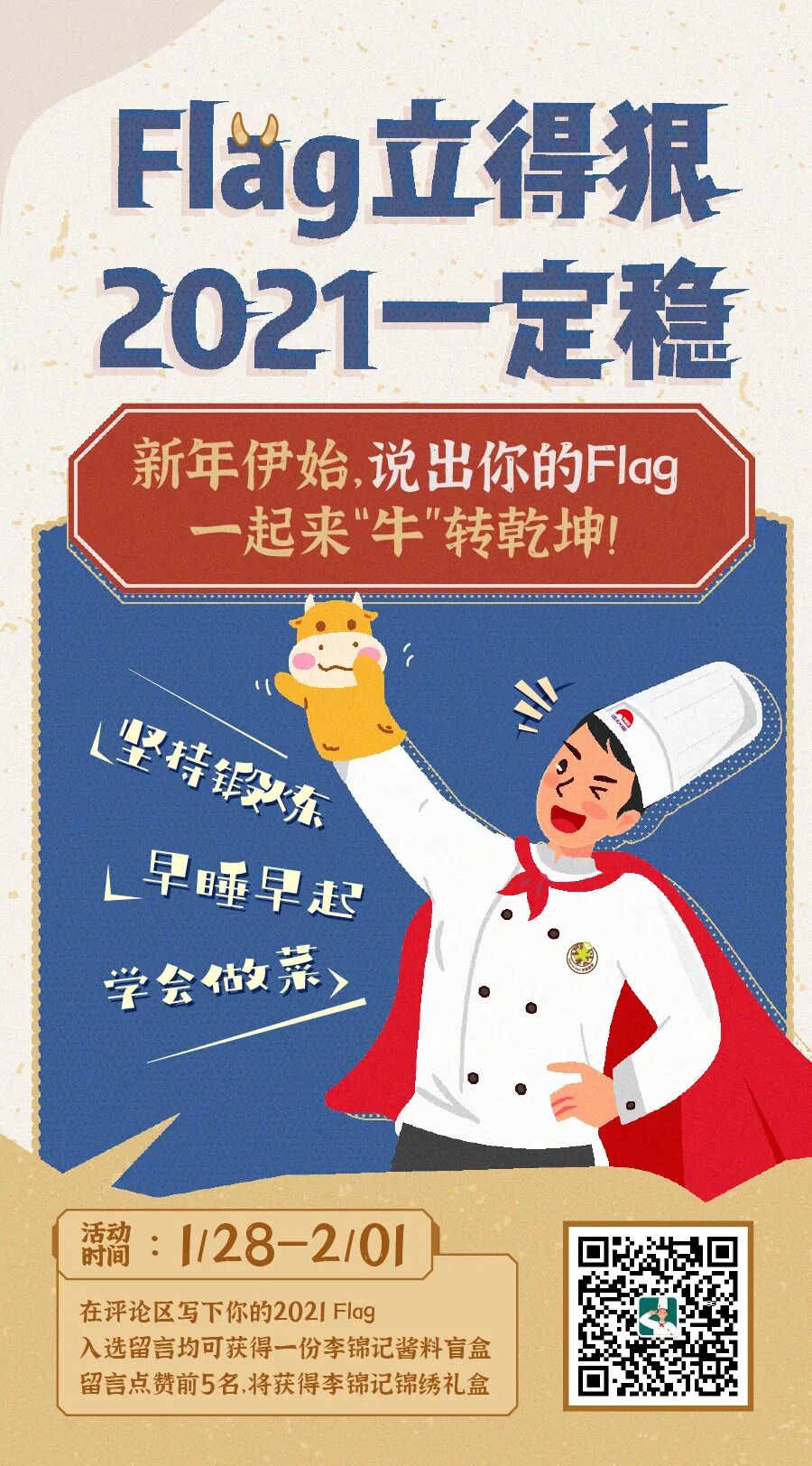 2020年,实“鼠”不易,我们一边普通着为生存沉浮,一边闪耀着为梦想奋斗。不管2020年的Flag完成的如何,在2021开年之际,年轻人,抖起精神!让我们斩断过去的遗憾,握紧真实的当下,与李锦记希望厨师一起,立下2021的Flag,新年一起燥起来!扫码关注“李锦记希望厨师”公众号,在原文(文末阅读原文处)评论区留下你的“2021年度Flag + 立下的理由”