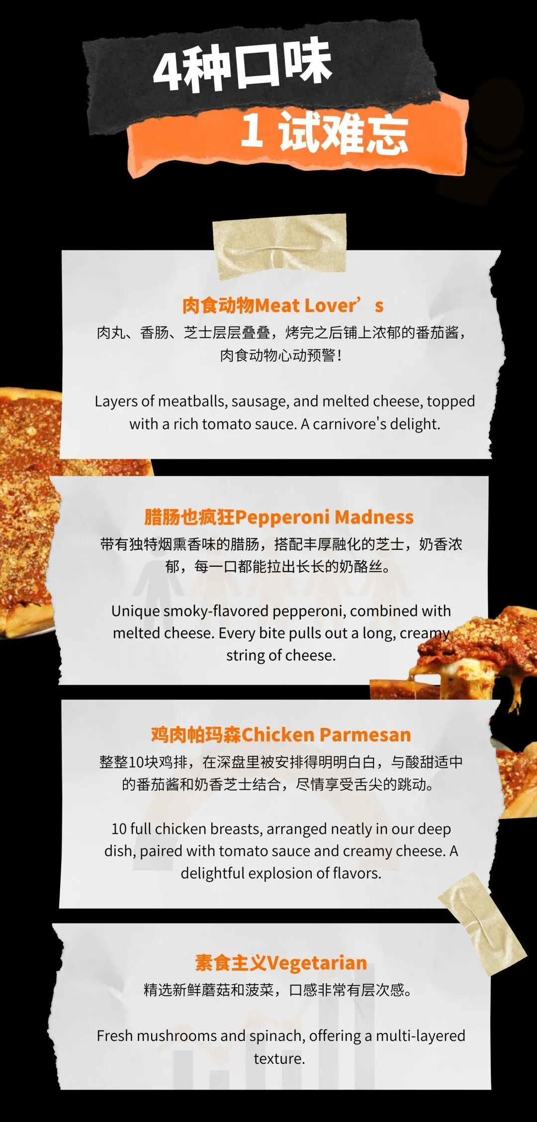 全程手工制作,选用意大利面团,面团加入啤酒醒发24小时,饼底厚实而酥脆,坚固的深盘结构完美承载了丰厚的馅料。