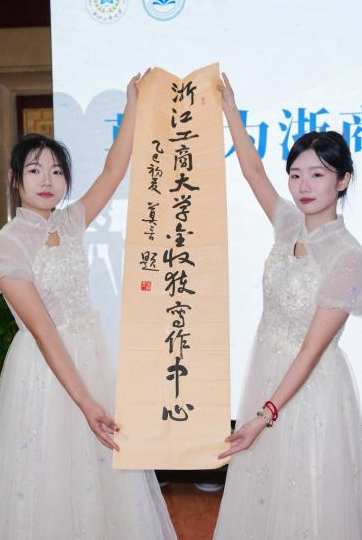 在5月27日第二届文学周启动仪式现场,特别展示了中国当代作家、首位中国诺贝尔文学奖获得者莫言“浙江工商大学金收获写作中心”“金收获书房”的两幅题字,这份题字承载着莫言对金收获写作中心的殷切期望,也寄托着将其建设成为更成熟、更优质文学创作与交流平台的真挚祝福。