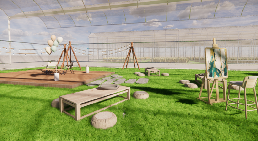 “大棚采摘区改用可拆卸汀步,休闲区的露营桌椅选择轻便款式,方便村民收纳。河滨步道保留原有的行道树,增加鲜花种植,并采取人工草坪……”