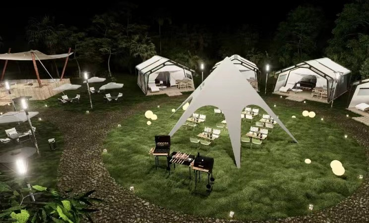 户外设计方案里更是藏着惊喜。登上观景台,游客便会发现整片稻田化作巨幅山水画,让人忍不住合影留念。午后,清澈的溪边会支起遮阳帐篷,钓鱼竿一甩便能收获半日悠闲;傍晚,草坪上篝火摇曳,烧烤架飘香伴着吉他民谣,连樱花树都跟着音乐轻轻摇摆。