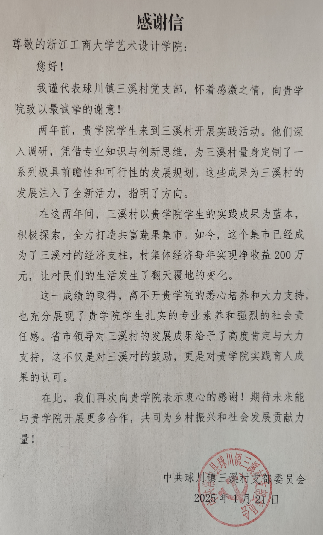不久前,浙江工商大学收到了一封来自衢州市常山县球川镇三溪村的感谢信。村支书激动地向学校艺术设计学院的8名浙小商表达感激之情。