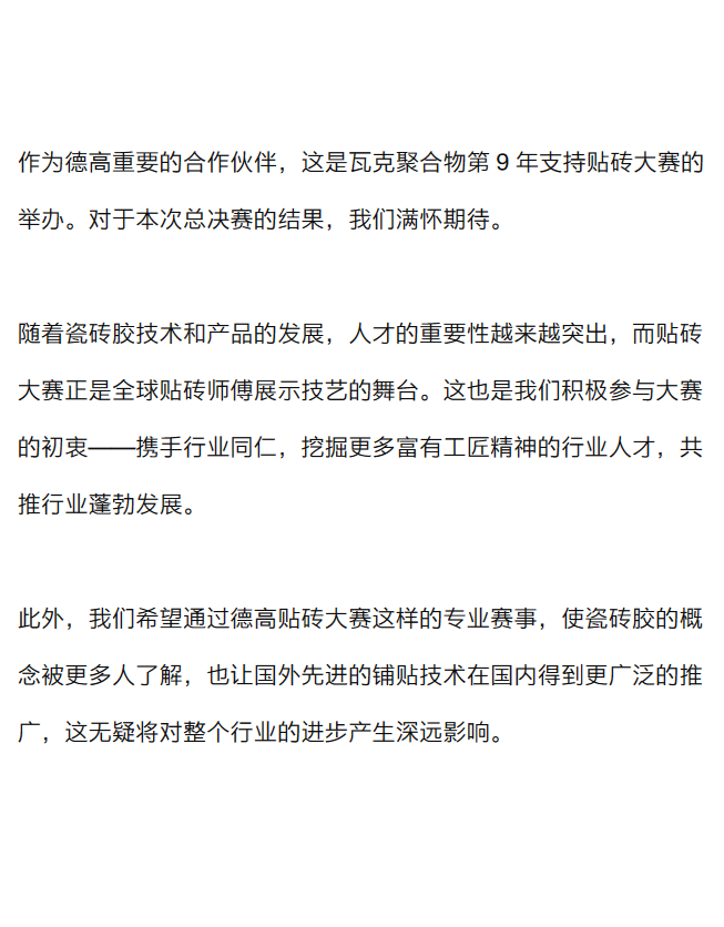 作为全球领先的化学品公司,瓦克多次参与德高贴砖大赛,请问您如何看待本次活动?