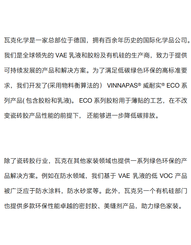 绿色环保的材料是未来家居装修的趋势。瓦克在家装领域有哪些绿色环保的创新型产品?