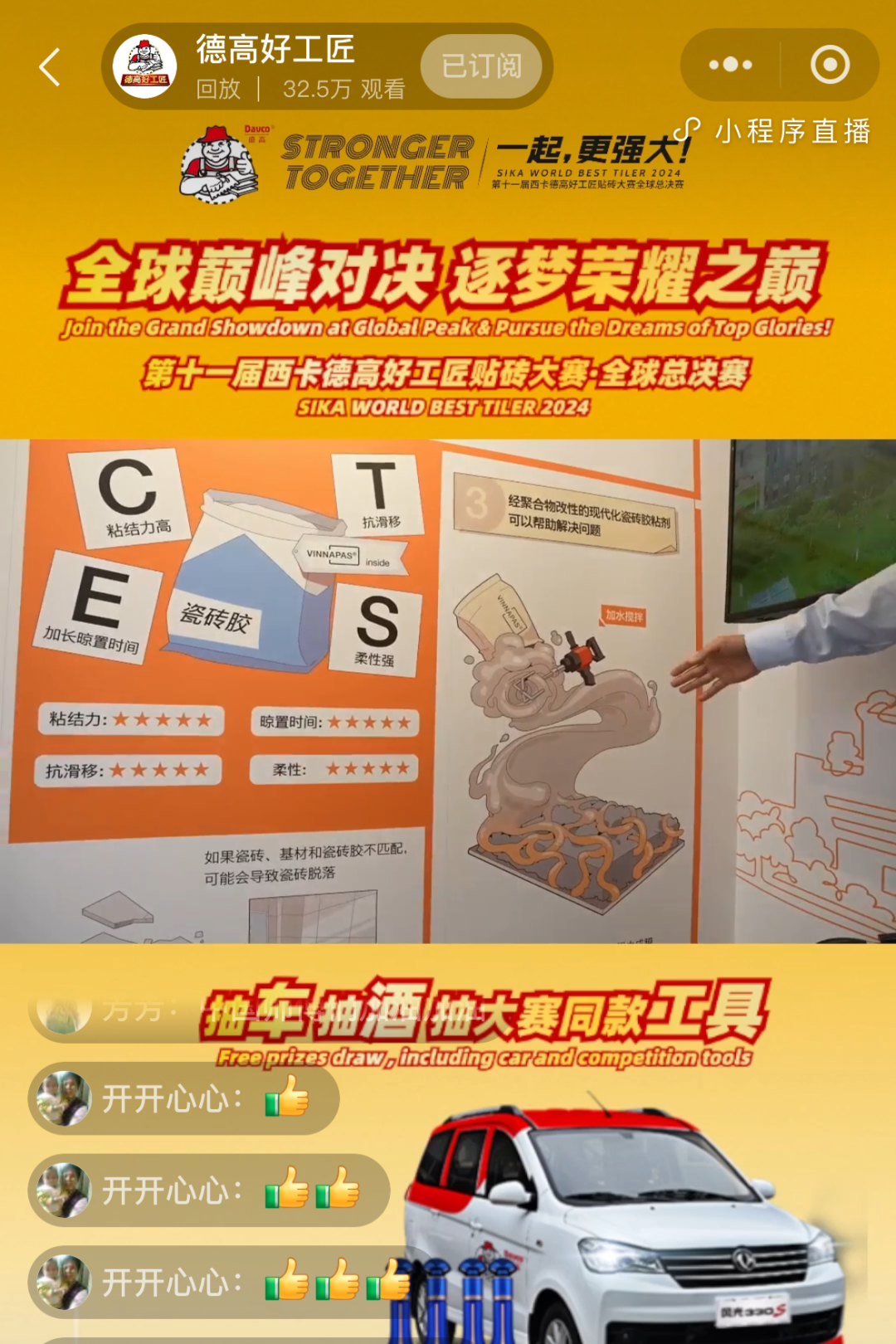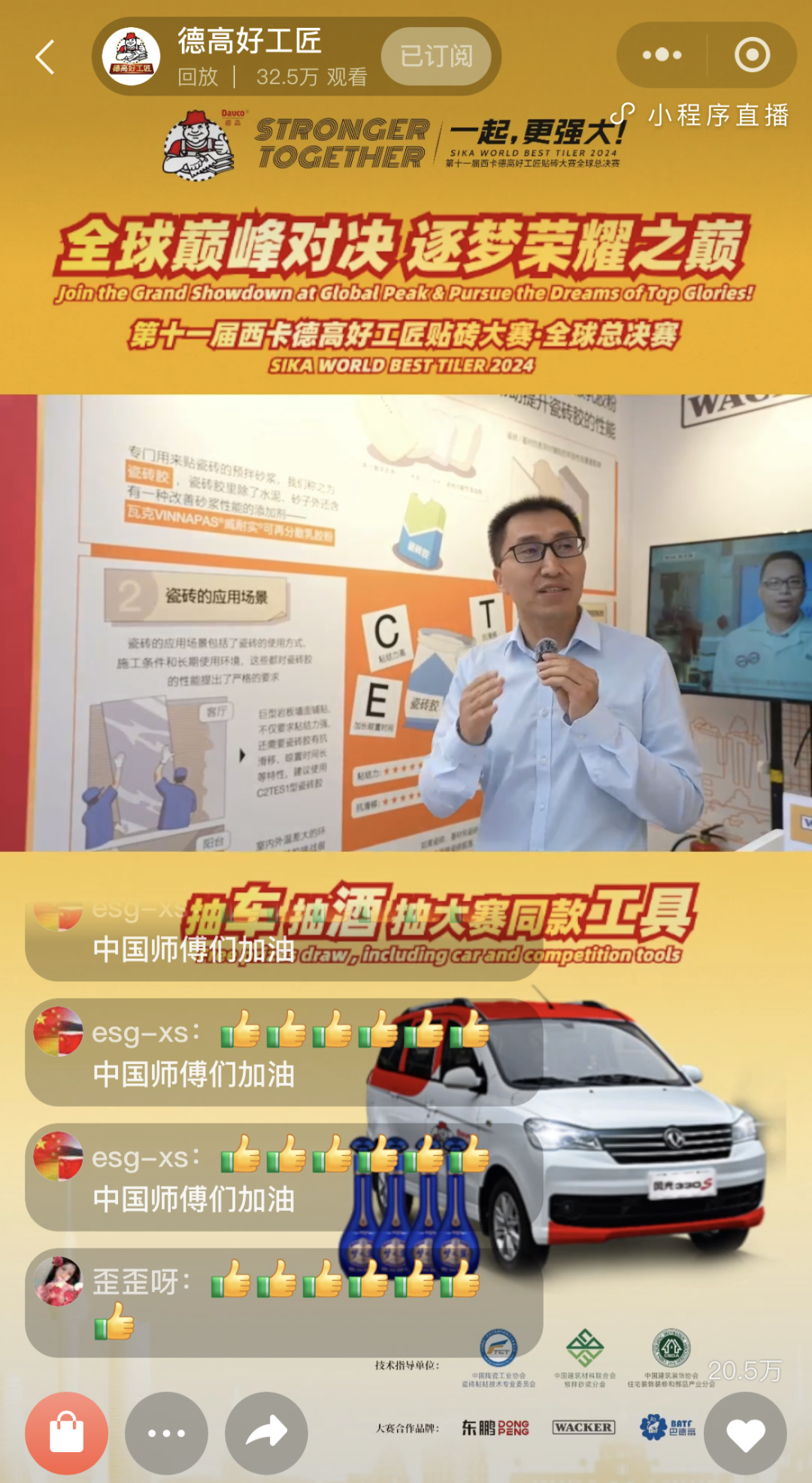 在活动现场,德高好工匠直播平台同步直播了这次赛事,当天观看人数更是超过了320,000人。瓦克技术专家来到了活动现场并在德高的直播间为广大的消费者和贴砖工匠介绍VINNAPAS®威耐实®可再分散乳胶粉在瓷砖胶中的重要作用。