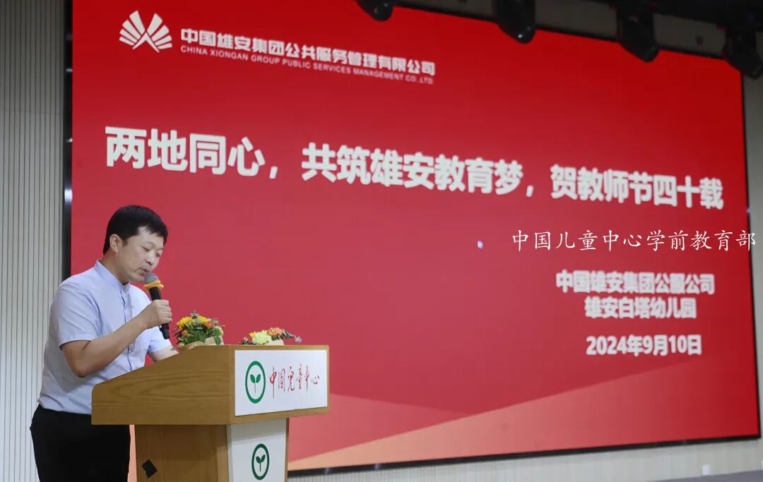 中国儿童中心副主任杨彩霞在致辞中代表中国儿童中心向前来参会的雄安同仁、学前教育部的全体教职员工致以节日的亲切问候!对大家携手雄安白塔幼儿园“共润童心,共育未来”表示衷心地感谢!杨彩霞表示,设立雄安新区是以习近平同志为核心的党中央作出的一项重大历史性战略选择,是千年大计、国家大事。自年初雄安白塔幼儿园筹建,到试运行,再到现在的常态化运营,老师们用心用情向白塔幼儿园持续传递前沿的学前教育理念、提供专业的技术支持、输入优质学前教育资源,为雄安白塔幼儿园“办好人民满意的幼儿园”迈上新台阶。人生百年,立于幼学。杨彩霞对老师们提出了三点希望和要求:9月8日,中央文献出版社正式出版了习近平总书记的《论教育》专题文集,希望老师们都好好学习,大力弘扬教育家精神,坚持为党育人、为国育才的初心使命,立德树人;今年是京津冀协同发展战略实施十周年,希望大家继续共同努力,携手为雄安学前教育发展做出新贡献;教育大计,教师为本,希望每一名老师都做最好的自己,培育最好的未来。中国雄安集团公共服务管理有限公司副总经理张岩磊指出,自雄安集团公共服务公司(以下简称:公服公司)与中国儿童中心合作以来,中国儿童中心为白塔幼儿园派驻核心团队、提供先进的教育理念以及丰富的教育资源,通过定期专家指导、教师培训、教学观摩等形式,帮助白塔幼儿园团队不断提升专业素养和教学能力。雄安白塔幼儿园通过积极反馈经验和问题,促进了双方在家园共育、后勤管理、教育教学等方面深入交流与合作。张岩磊强调,通过协同共育,中国儿童中心把习近平总书记的贺信精神、学前教育前沿理念带到了雄安。张岩磊表示,公服公司将继续与中国儿童中心保持紧密合作,深化交流,共同探索学前教育发展的新模式、新路径,未来的雄安白塔幼儿园会在王孝瑜园长的带领下、在中国儿童中心的专业引领下,为雄安教育事业的发展注入新的活力。