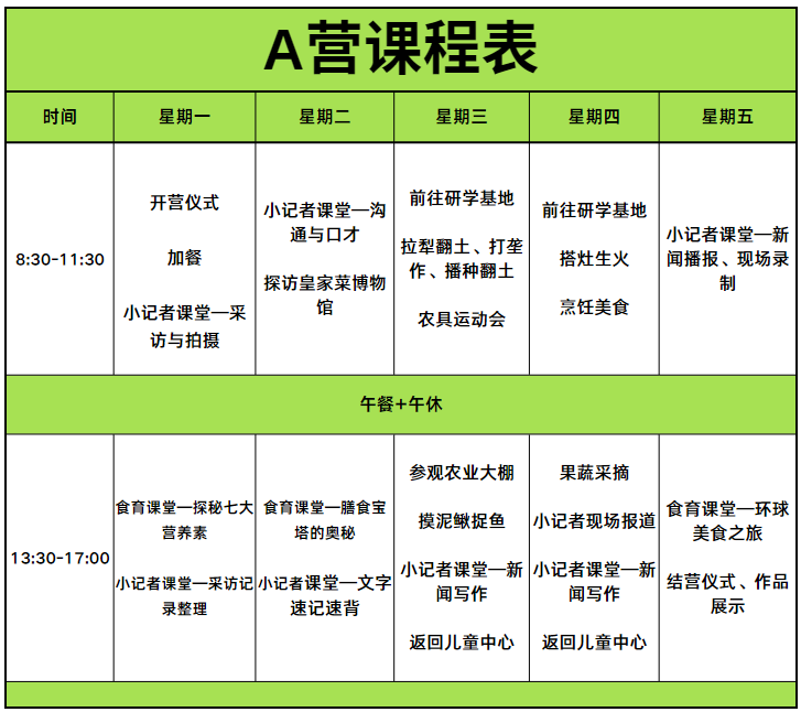 五日夏令营中,第三天和第四天将前往研学基地开展活动,因研学基地不同,活动内容不同,“食育小记者”分为A营和B营。