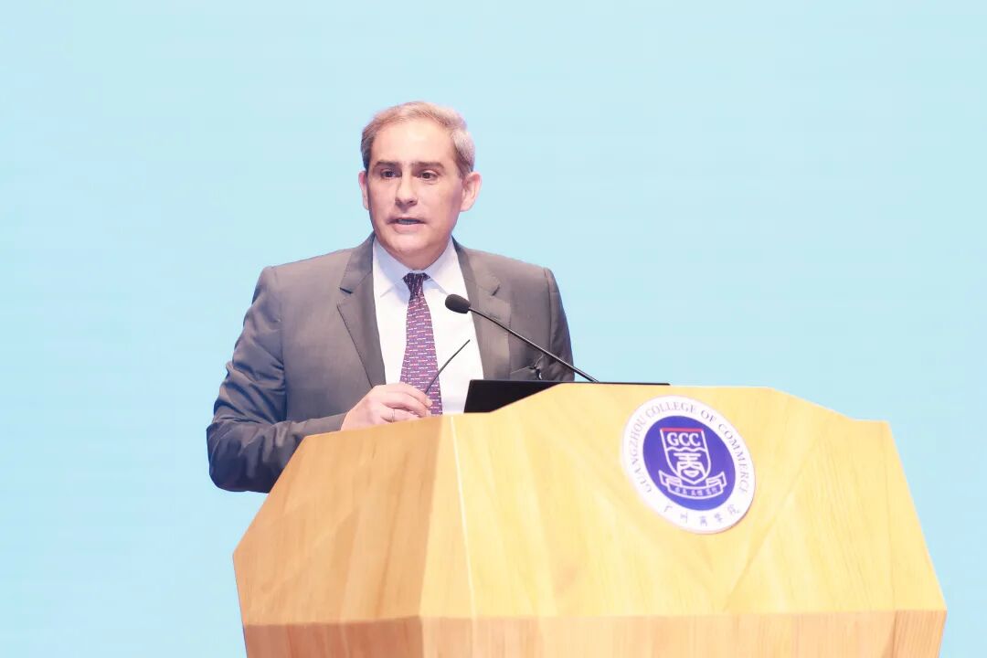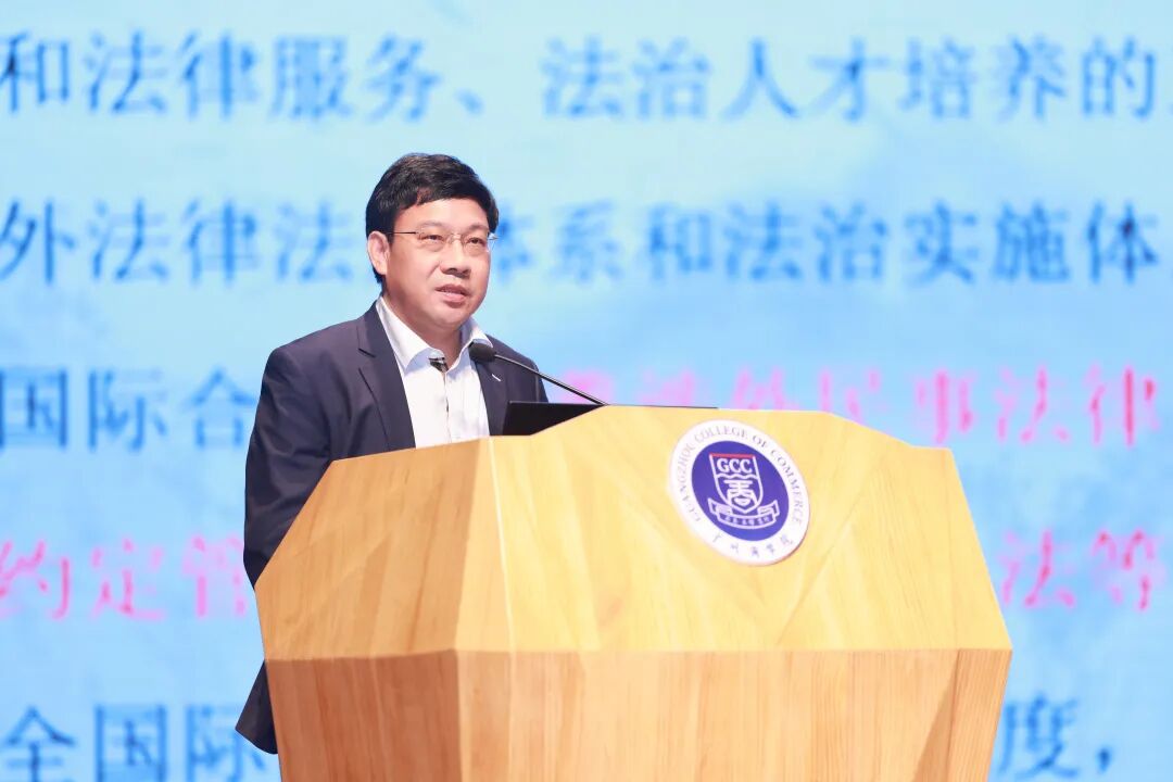 学校党委副书记、纪委书记、常务副校长何柏略在致辞中代表学校向各位嘉宾的到来表示热烈欢迎,向长期以来关心支持广商发展的各位领导、朋友们表示衷心感谢。他简要介绍了学校的发展历程、办学成果、法学院学科专业建设和涉外法治人才培养等情况。