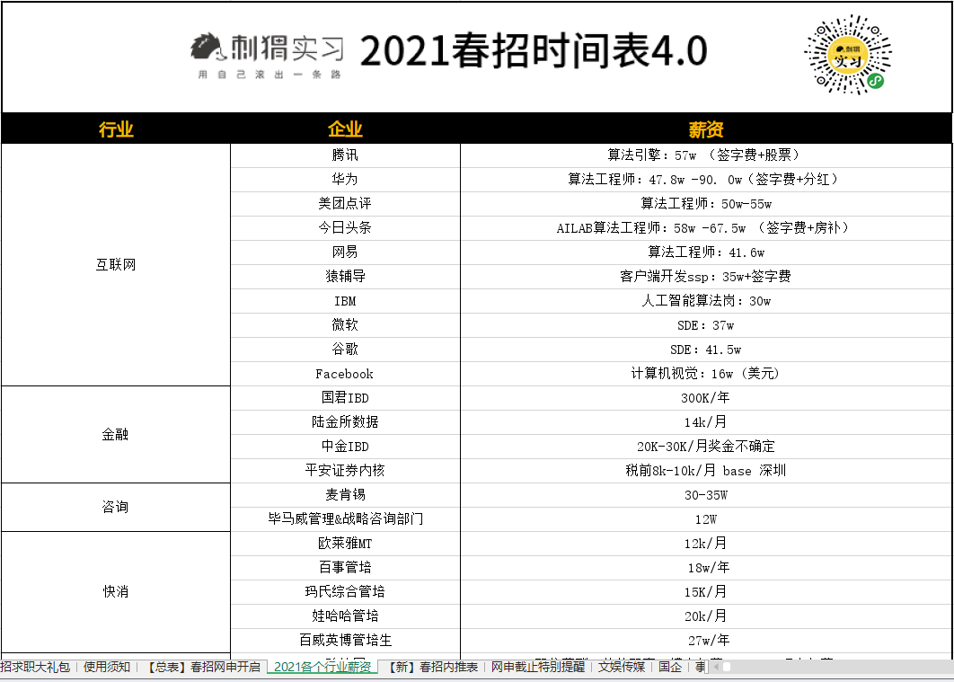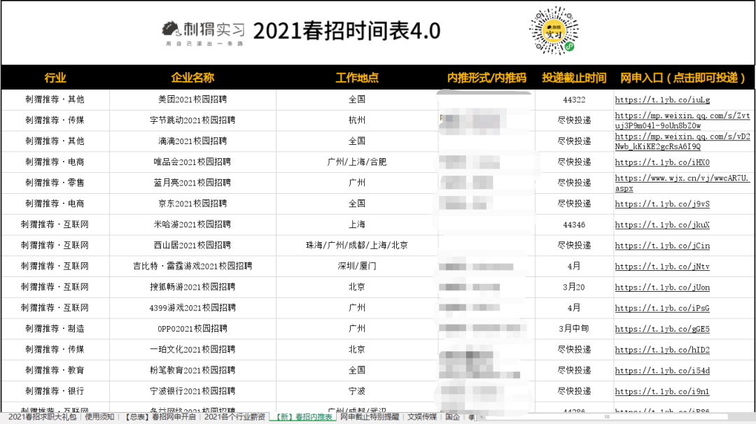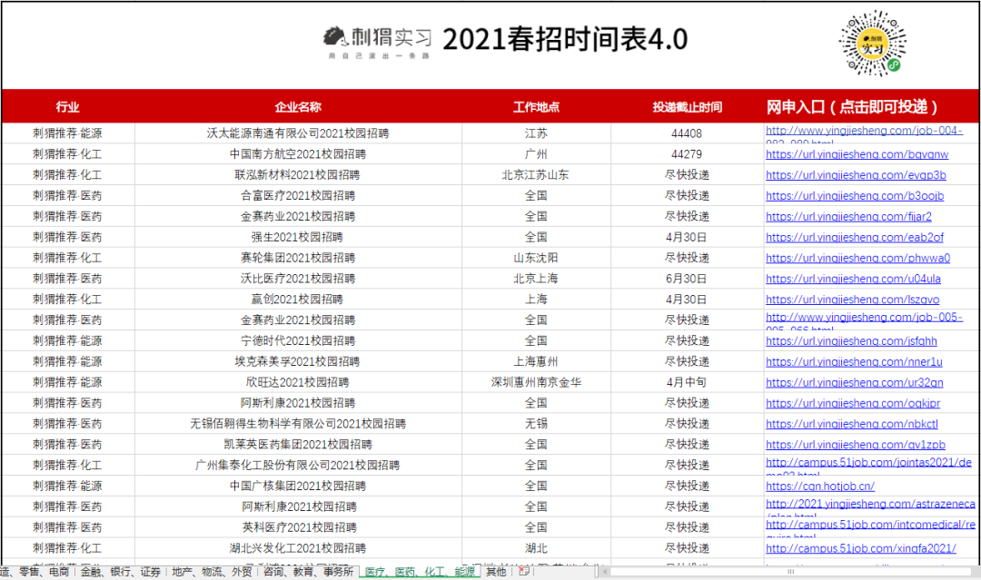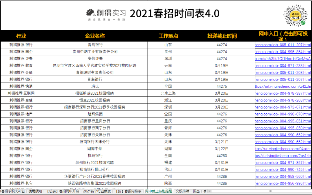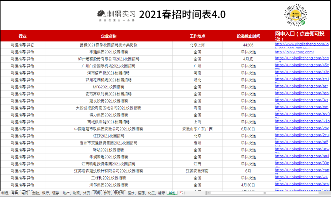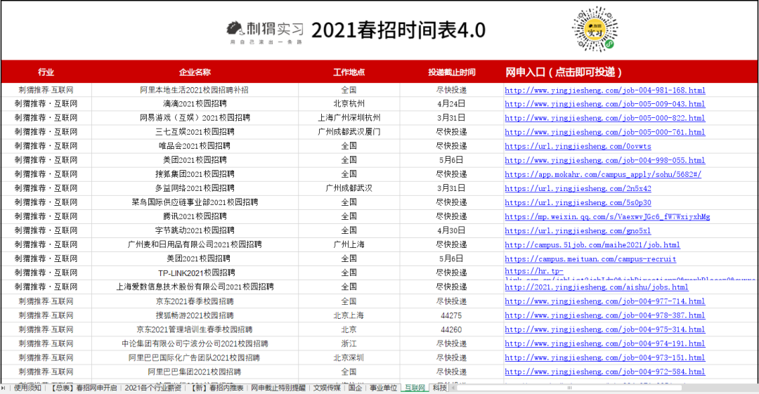 海量名企网申起止时间、精选优质岗位网申动态、2021各行业企业薪资,刺猬的春招时间表都为大家准备好了。