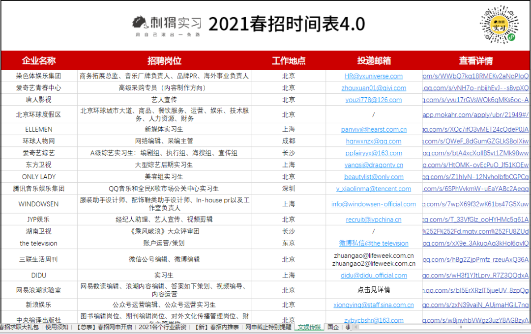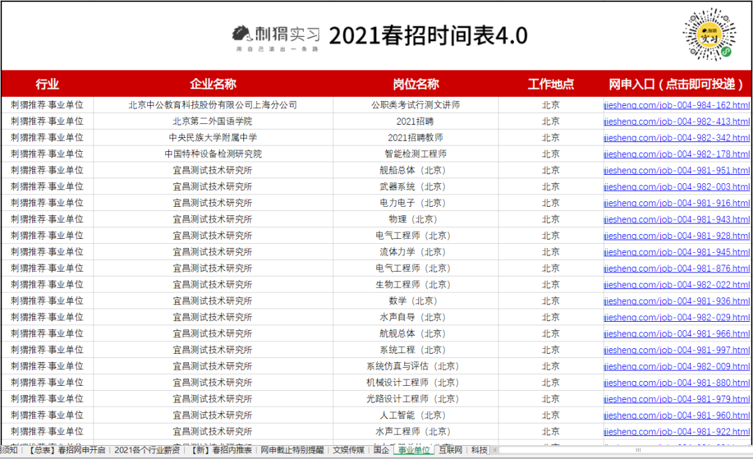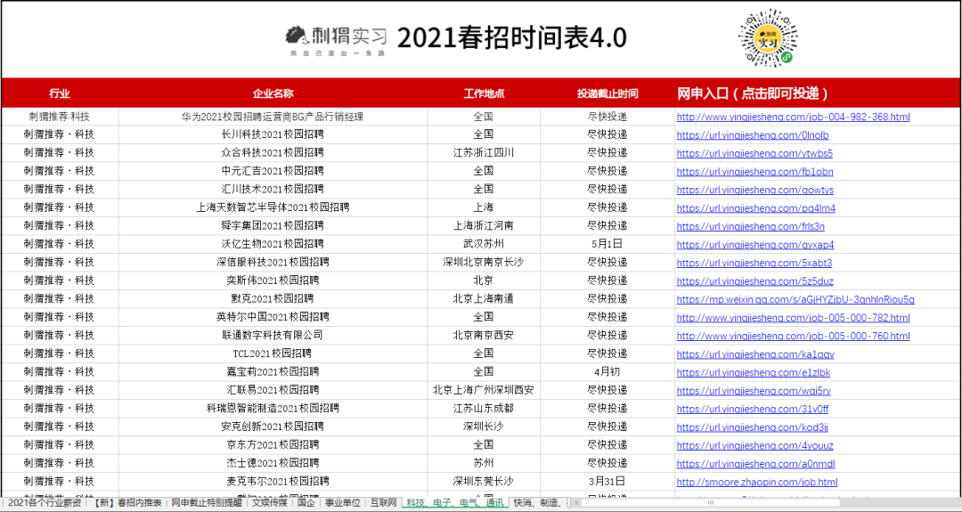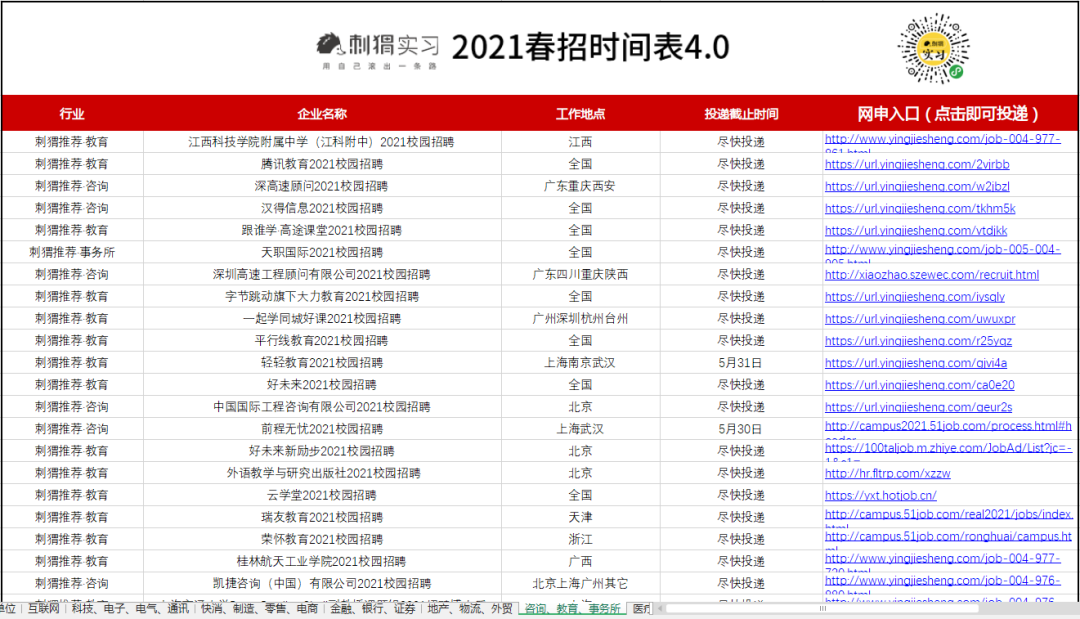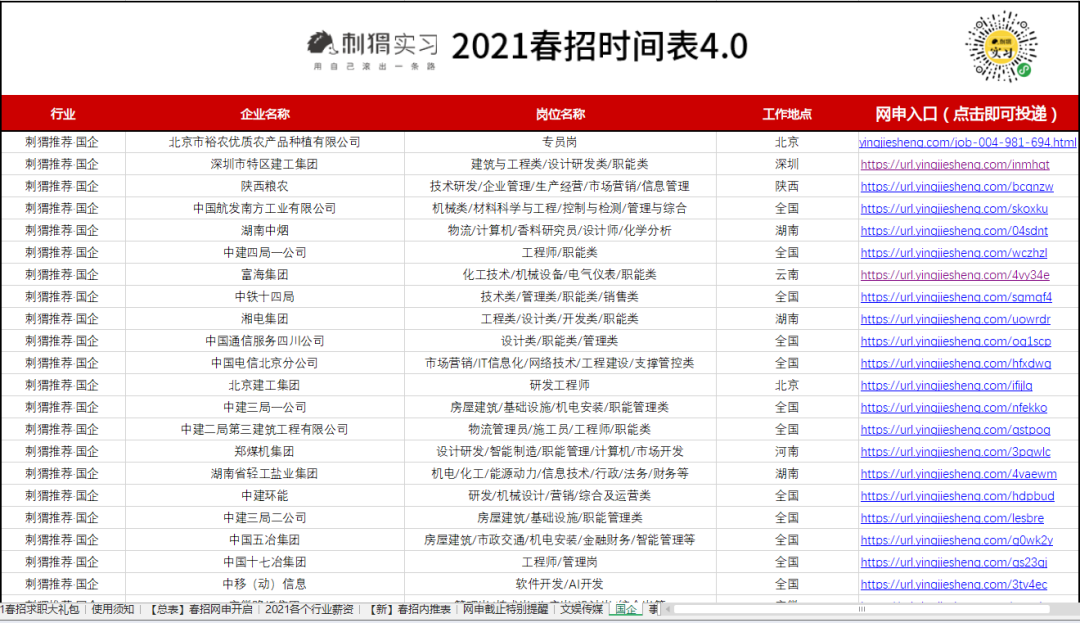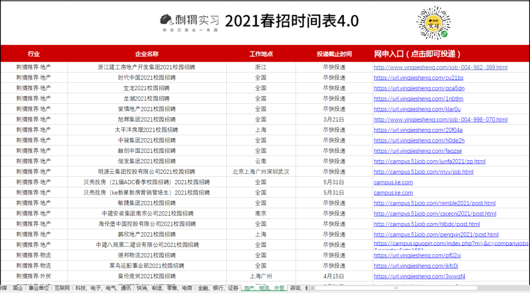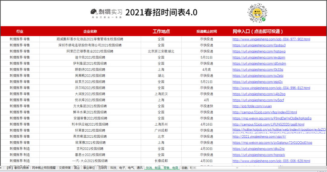 海量名企网申起止时间、精选优质岗位网申动态、2021各行业企业薪资,刺猬的春招时间表都为大家准备好了。