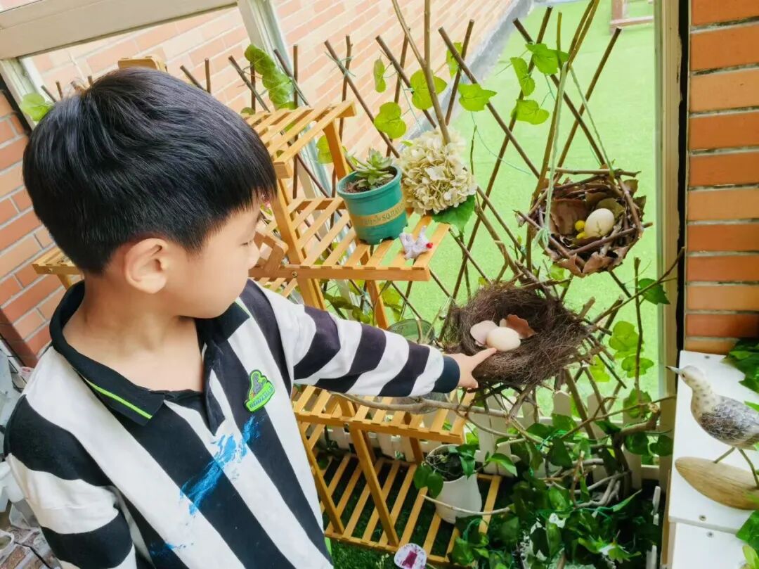 中大班的自然角则从幼儿兴趣点切入,有栩栩如生的鸟巢、自制温室、种子基地等,不少班级利用自然角的材料进行手工制作,让科学探究与艺术创造自然融合,用创意与巧思搭建起观察自然、走进科学的微观世界。