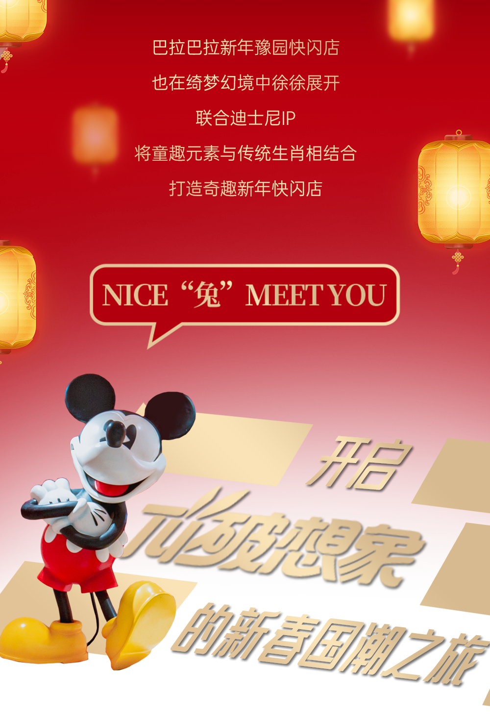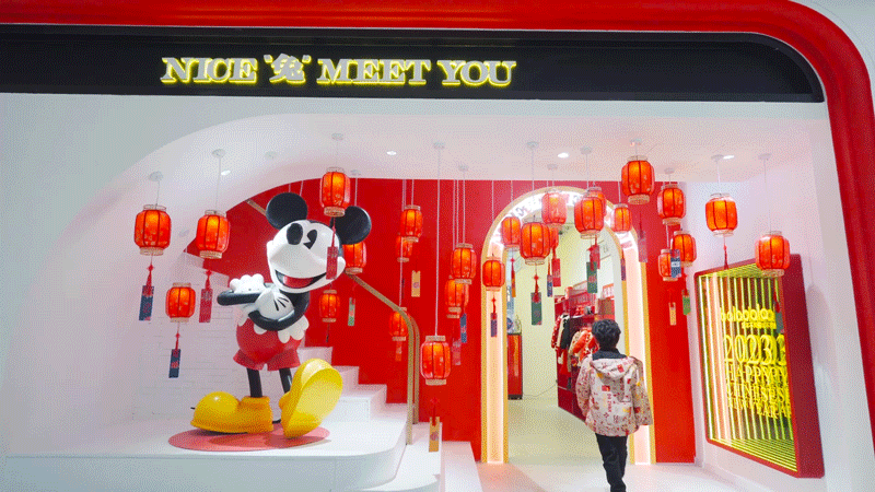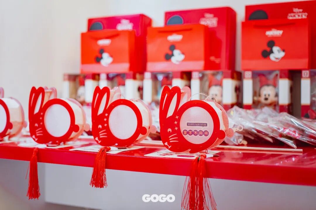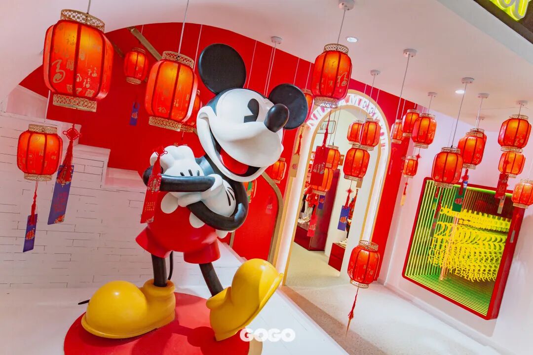 玩趣空间设计,沉浸式感受新年国潮的热闹氛围,戴着兔耳朵的米奇正向我们作揖拜年呢!