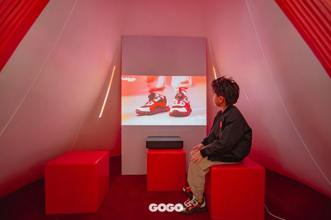 走进快闪空间,红色通天拱形帐篷,在金色巴拉巴拉字母标志下十分酷炫。走进红色帐篷空间,屏幕正播放新品系列大片和迪士尼动画片。