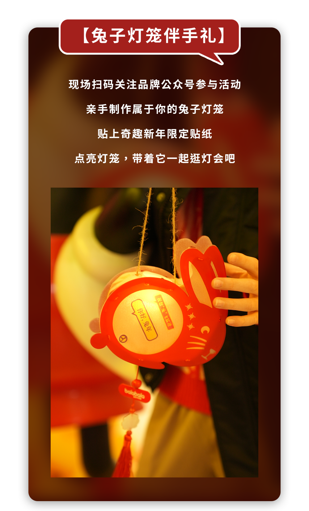 特别节日专属品牌“兔子灯笼”,亲手制作代表着美好寓意的兔子灯笼,让温暖延续。用滚轴DIY新年红包和专属帆布袋,亲手制作让心意和祝福多点爱。