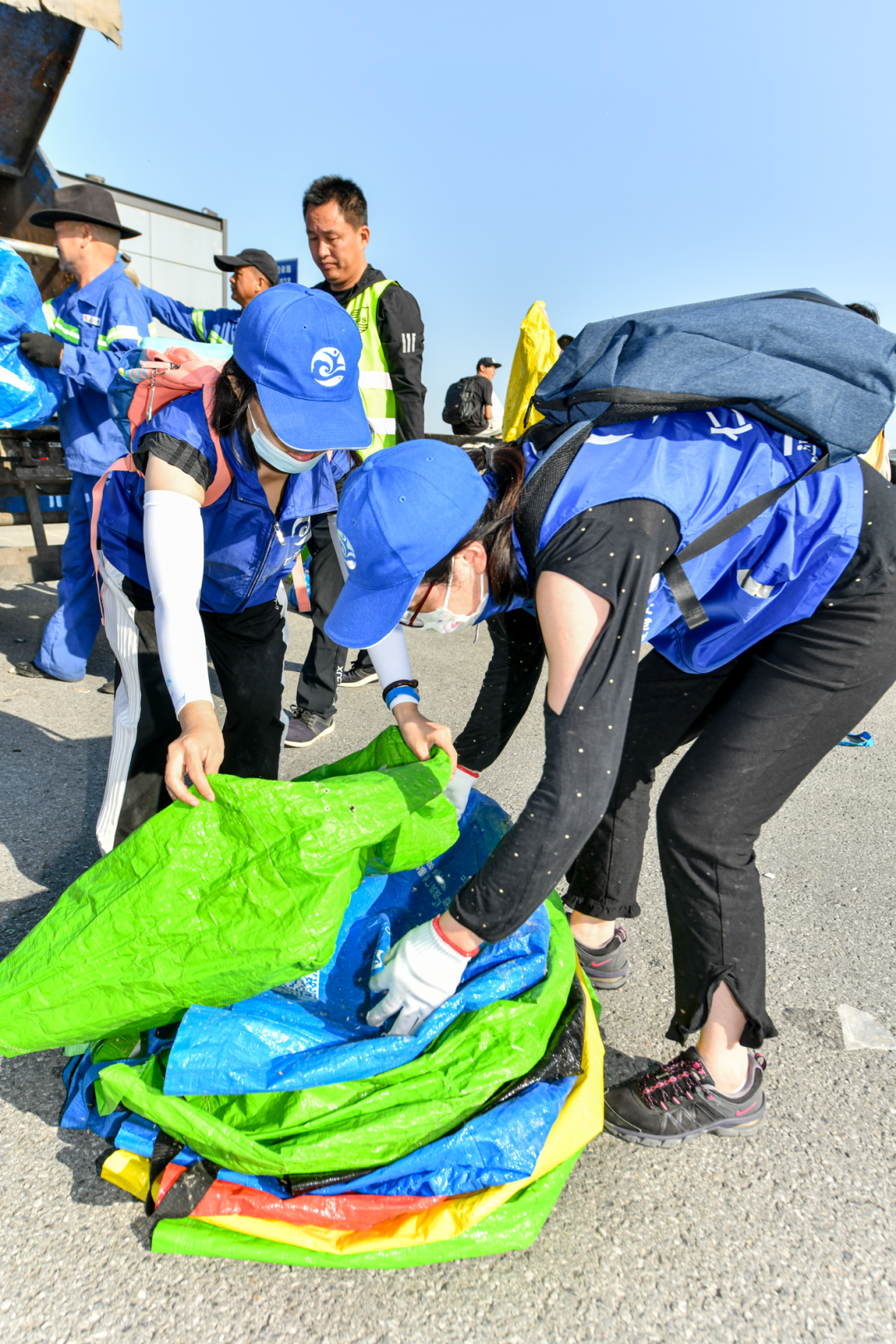 与志愿者共同清理海滩垃圾