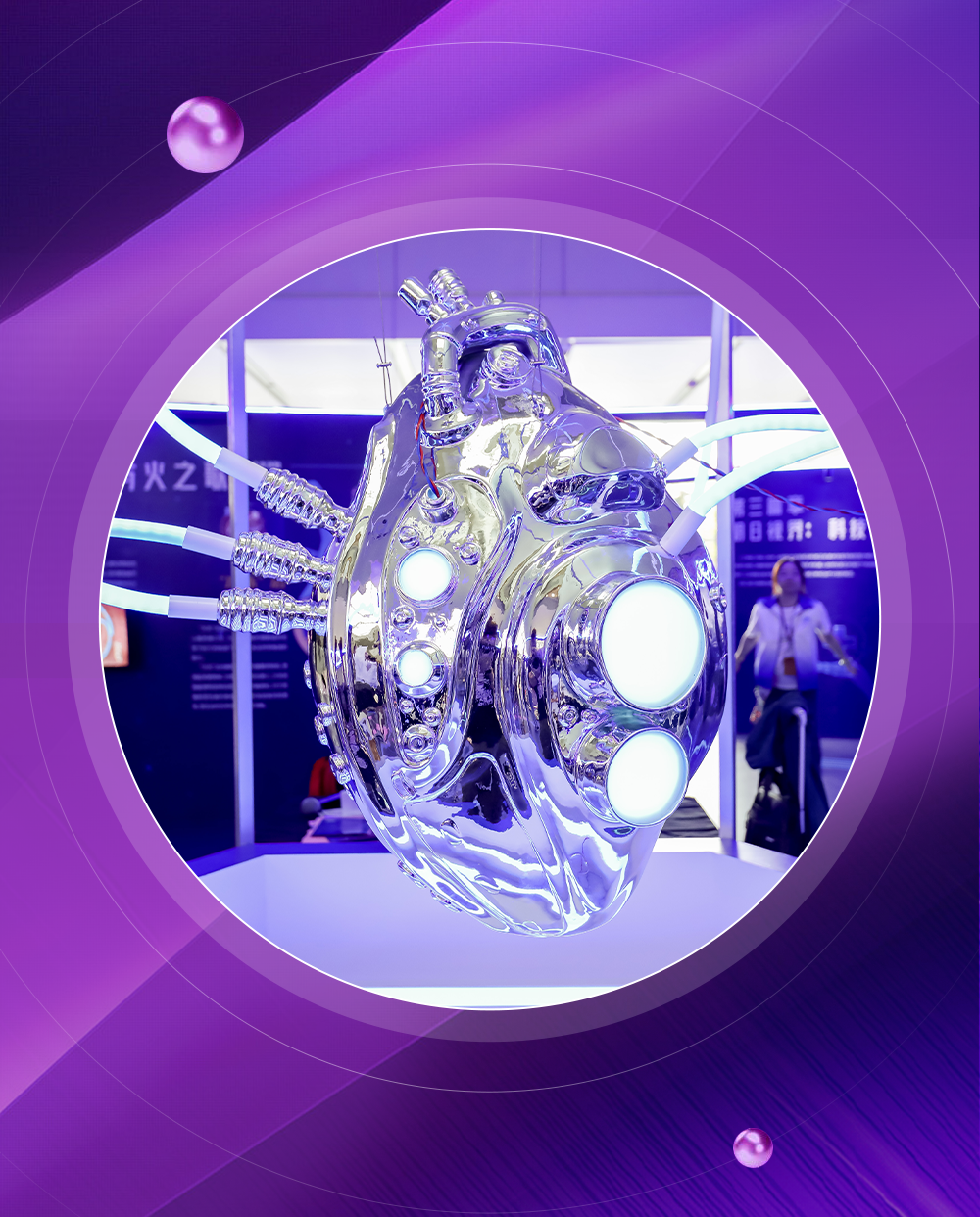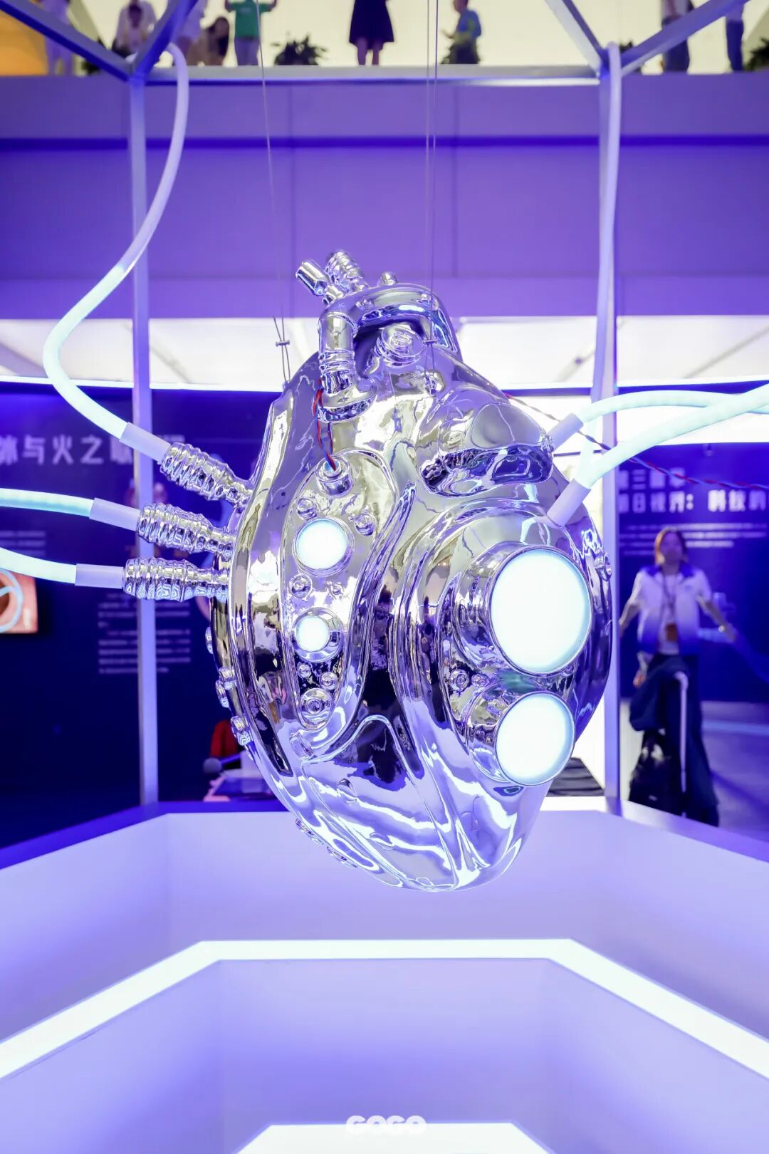 位于「生命引擎·心脏的故事」中心处的是“心电脉动”科学艺术装置——通过赛博机械的光管与电极导线,将人体生物电视觉化,结合动态灯光设计概念,直观感受电与人体心脏的碰撞。